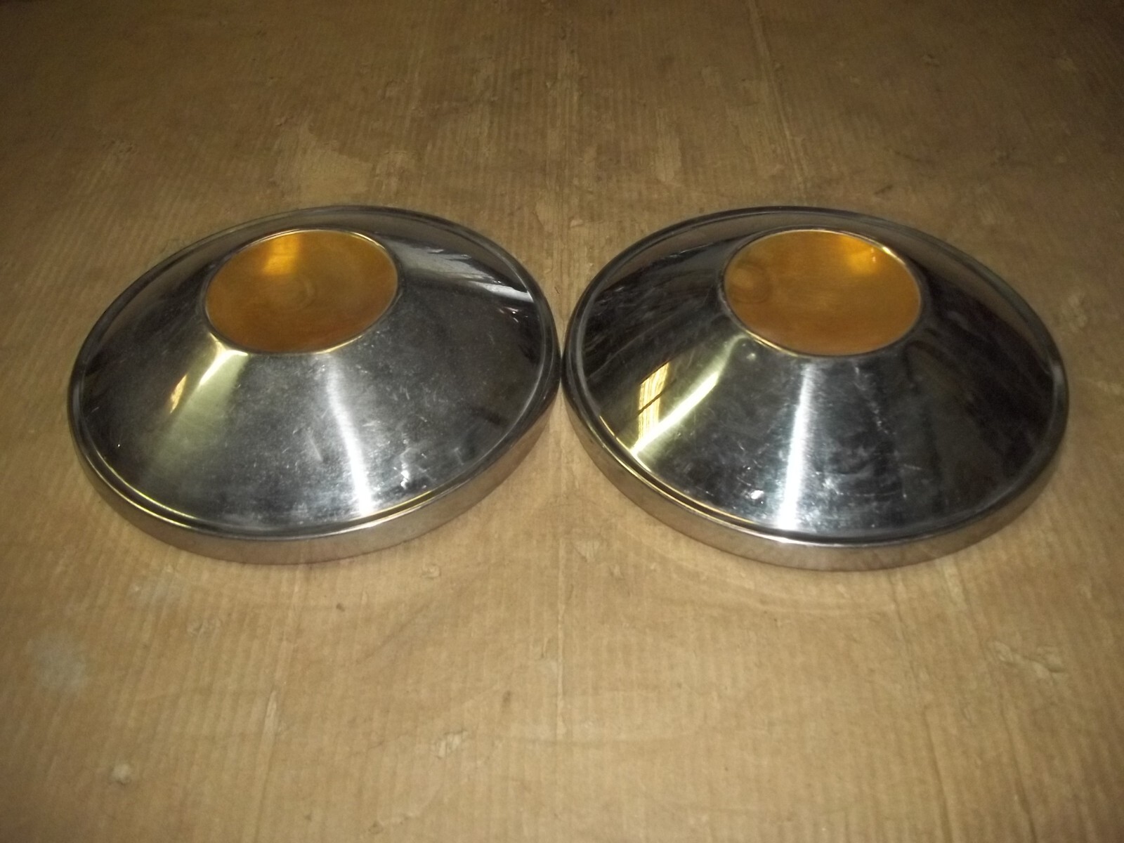 A pair of two (2) 54-55 Studebaker factory center hubcaps.Match pictures and description for correct replacement.Measure about 10 1/2" across the back.Magnet sticks to this pair.This is a VERY used pair of two hubcaps with MANY scratches / scrapes and dings / dents.These scratches / scrapes and dings / dents will be noticeable from even a short distance.Entire faces dinged and dented.The original finish is VERY faded and worn due to time.Oxidation and corrosion.Staining that does not polish out.Pitting as pictured.Paint scratched and worn.Slightly bent out of round when laid flat but attach to wheels as designed.Driver car quality.On a scale from 1 to 10, these rate a "5" in condition.Buyer to pay shipping with a flat rate of $18 within the continental U.S..Elsewhere there are additional charges.Accept most methods of payment.California buyer to pay state sales tax.