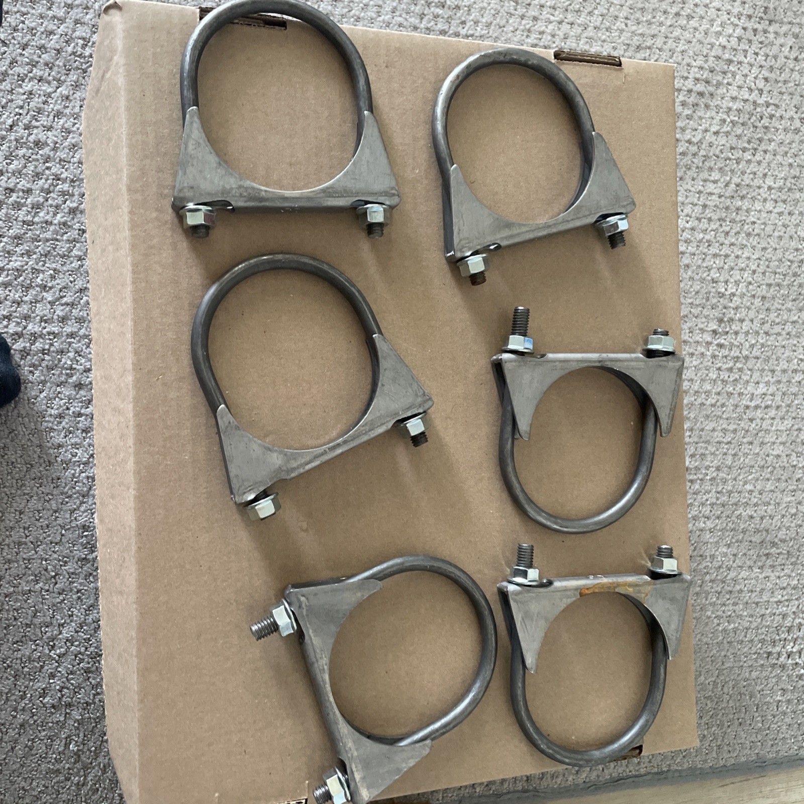 Mixed lot of six standard U‑bolt exhaust clamps, ideal for mufflers, pipes, or resonators. Includes both 2¼” and 2½” sizes. All clamps have saddles and nuts. Great for DIY exhaust work, shop inventory, or backup hardware. Details • Quantity: 6 clamps • Sizes: Mix of 2¼” and 2½” • Style: Saddle‑style U‑bolt clamps • Condition:• 5 clean/new • 1 with light surface rust • Markings: Stamped “3” — batch code