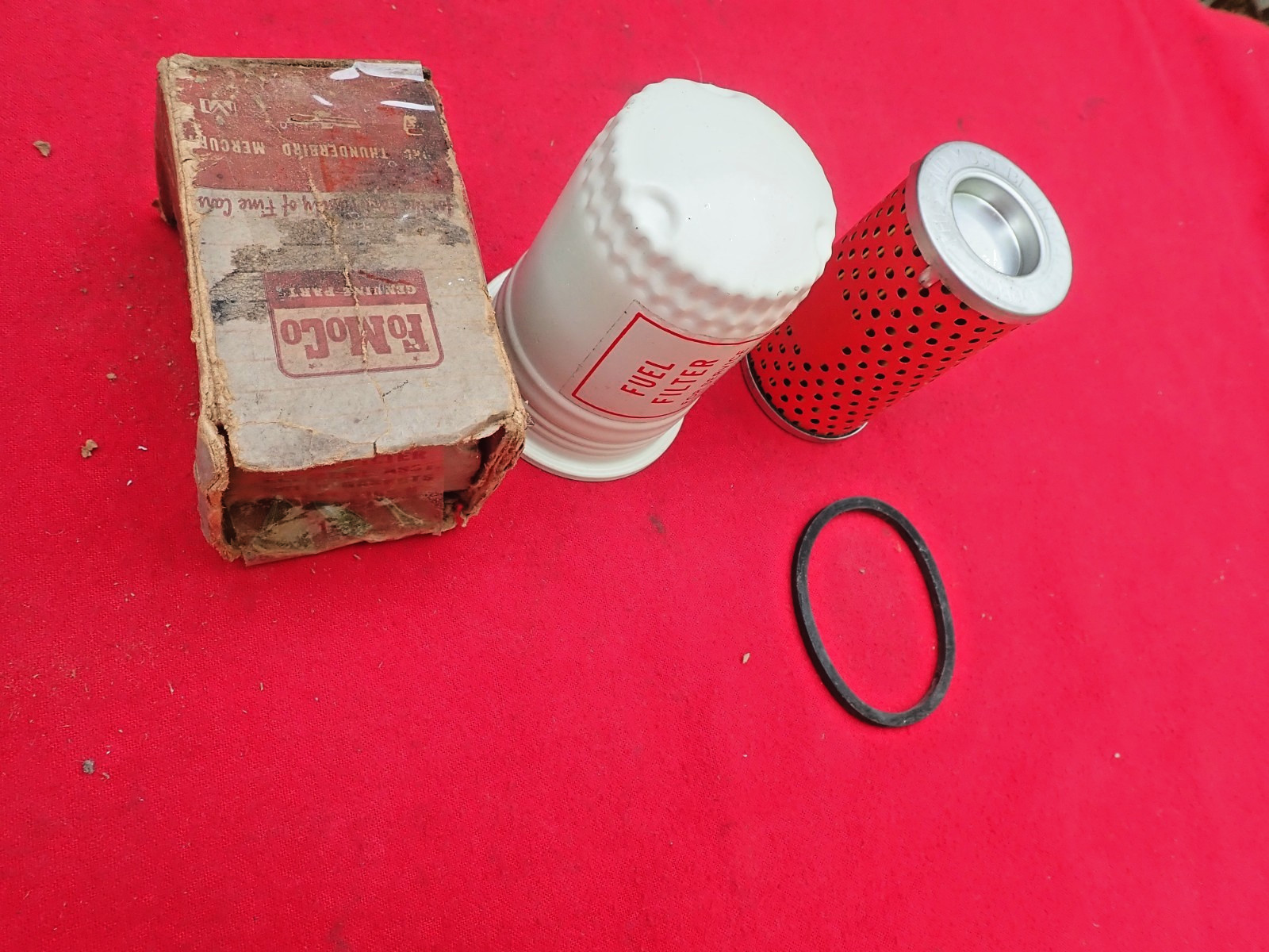 This is a NOS Ford fuel filter and an old school original Ford fuel filter can which is correct for many 1962 1963 1964 1965 Ford and Mercury cars. This includes many Ford High Performance engines of that period. The filter is NOS Ford and the can is a super nice dent free original correct design Ford can which has been bead blasted and correctly painted with a replacement decal installed. No dents or dings. Has the early style correct "serrated" style of can. All original Ford, no import repro crap here!