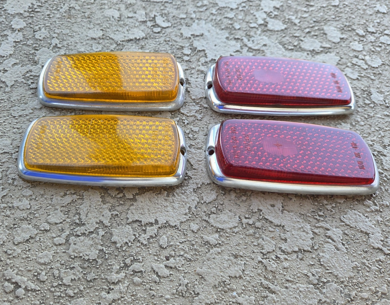 # 1968 - 1972 MERCEDES BENZ W114 W115 # ORIGINAL SIDE MARKER LIGHT LENS SET ## This listing is for the 4 original marker lenses pictured. The lenses are used and have some fissures inside the plastic but overall are in good condition. The bezel show some age but still look good and are not dented or bent. The mounting tabs on the back of the lenses are all in good condition. Please look at the photos closely and judge for yourself, these are the lenses you will receive. The buyer is responsible for fitment. Thanks for looking.