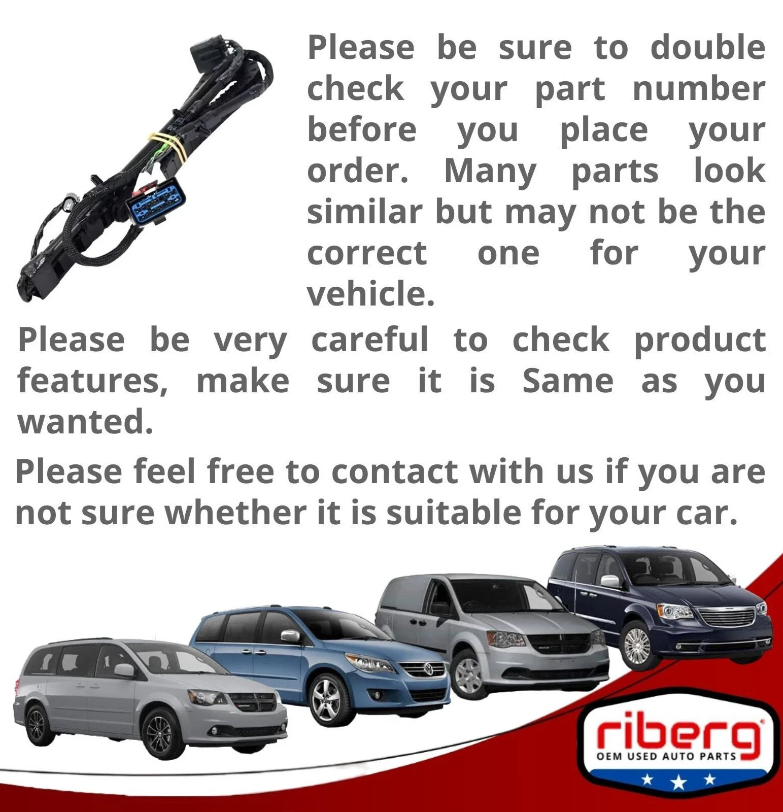 ## ITEM DESCRIPTION: # 68211875AA OEM MOPAR 13-16 Town & Country Sliding Door Left Wire Track TESTED ## \\_\\_\\_\_\_\_\_\_\_\_\_\_\_\_\_\_\_\_\_\_\_\_\_\_\_\_\_\_\_\_\_\_\_\_\_\_\_\_\_\_\_\_\_\_\_\_\_\_\_\_\_\_\_\_\_\_\_\_\_\_\_\_\_\_\_\_\_\_\_\_\_\_\_\_\_\_\_\_\_\_\_\_\_\_\_\_\_\_\_\_\_\_\_\_\_\_\_\_\_\_\_\_\_\_\_ ## ITEM CONDITION: Good - Normal Use - Minimal signs of wear - As shown in the photos - Proper working condition 90 DAY WARRANTY \\* FREE SAME DAY SHIPPING \\* Cleaned, Packed and Ready to Ship Today! \\_\\_\\_\_\_\_\_\_\_\_\_\_\_\_\_\_\_\_\_\_\_\_\_\_\_\_\_\_\_\_\_\_\_\_\_\_\_\_\_\_\_\_\_\_\_\_\_\_\_\_\_\_\_\_\_\_\_\_\_\_\_\_\_\_\_\_\_\_\_\_\_\_\_\_\_\_\_\_\_\_\_\_\_\_\_\_\_\_\_\_\_\_\_\_\_\_\_\_\_\_\_\_\_\_\_ ## PLEASE NOTE: - PLEASE VERIFY THE COMPATIBILITY BEFORE BUYING OR REACH OUT AND WE WILL ASSIST - IT IS THE BUYER'S RESPONSIBILITY TO DETERMINE WHETHER THE PART WILL FIT HIS/HER CAR. - PLEASE MAKE SURE TO MATCH THE PART NUMBER WITH YOUR ORIGINAL PART. - WHAT YOU SEE IN THE PHOTOS IS WHAT YOU WILL RECEIVE. THE PHOTOGRAPHS ARE AN ACCURATE DEPICTION OF THE ITEM, WHAT YOU SEE IN THE PHOTOS IS WHAT YOU WILL RECEIVE. ITEM MAY SHOW LIGHT SCUFFS, SCRATCHES OR OTHER IMPERFECTIONS AS A RESULT OF THIS BEING A USED ITEM. IF YOU NEED ADDITIONAL PHOTOS, PLEASE FEEL FREE TO REACH OUT TO US. You will only receive what is pictured unless otherwise stated in the description. Please do not assume anything else will be included if it is not pictured. All of the parts we sell are guaranteed to be in good working condition unless otherwise noted. We ONLY guarantee the part(s) will fit the vehicle(s) listed in the description. If your vehicle was not originally equipped with the EXACT part(s) listed, it is your responsibility to consult a dealer to see if it will fit your application. Additional items may be needed if this is an upgrade or custom installation. Please consult your local dealer for ALL other applications. RIBERG PARTS reserves the right to cancel/refund any order that had parts described incorrectly, had incorrect pricing information or was out of stock/damaged. We do our best to prevent these issues from happening and apologize for any inconvenience it may cause. \\_\\_\\_\_\_\_\_\_\_\_\_\_\_\_\_\_\_\_\_\_\_\_\_\_\_\_\_\_\_\_\_\_\_\_\_\_\_\_\_\_\_\_\_\_\_\_\_\_\_\_\_\_\_\_\_\_\_\_\_\_\_\_\_\_\_\_\_\_\_\_\_\_\_\_\_\_\_\_\_\_\_\_\_\_\_\_\_\_\_\_\_\_\_\_\_\_\_\_\_\_\_\_\_\_\_ SHIPPING POLICIES: - Ground shipping rates apply to the continental United States. International shipping rates apply everywhere outside of the continental US. - When shipping internationally, parcels may be subject to Import Tax and Duty Charges, for which the buyer is responsible. - Any international customs fees must be paid by the buyer. - Puerto Rico, Virgin Islands, Hawaii and Alaska will require additional shipping charges. - Most items ship the same day if ordered by 12pm CST. Processing time for small and medium items is 1 business day, 2 business days for oversized items or freight shipments (Hoods, Door shells, Engines, Transmissions etc.) - Large items can only be shipped to a business/commercial address via Freight Shipping. Delivering large items to a residential address will require extra cost/additional payment for Residential Deliver / Liftgate Delivery. - Freight Shipping companies require the customer to unload the shipment. If you are not able to unload your shipment, the shipping company will charge for unloading on your behalf. - To pass our shipping savings on to you, we may alternate between FedEx, USPS depending on which is most affordable and/or faster. - You are welcome to pick up your item at our warehouse location - please contact us for the address. Items eligible for return are non-functional or items that differ substantially from the description. Please, do not purchase parts just to check and diagnose your vehicle’s problem. - We are not liable for any labor fees associated with the installation or removal of any parts we sell. \\_\\_\\_\_\_\_\_\_\_\_\_\_\_\_\_\_\_\_\_\_\_\_\_\_\_\_\_\_\_\_\_\_\_\_\_\_\_\_\_\_\_\_\_\_\_\_\_\_\_\_\_\_\_\_\_\_\_\_\_\_\_\_\_\_\_\_\_\_\_\_\_\_\_\_\_\_\_\_\_\_\_\_\_\_\_\_\_\_\_\_\_\_\_\_\_\_\_\_\_\_\_\_\_\_\_ ### WARRANTY: - We offer a 90 DAY WARRANTY on all of our parts. (Parts ONLY - NO Labor) - Note: Please be aware that most of the parts we sell have been removed from used vehicles. While we provide accurate descriptions, in many cases, we have limited ability to test the parts and cannot guarantee their proper operation. However, we do offer a return policy for the first 30 days after you receive the item. Please note that returned items must be in the same condition as when we shipped. Thank you for your understanding. - Before purchasing an item, the customer MUST verify that the item will fit his/her vehicle. - Items may show light scuffs, scratches or other imperfections as a result of this being a used part. - Professional installation is highly recommended (No Instruction Included). \\_\\_\\_\_\_\_\_\_\_\_\_\_\_\_\_\_\_\_\_\_\_\_\_\_\_\_\_\_\_\_\_\_\_\_\_\_\_\_\_\_\_\_\_\_\_\_\_\_\_\_\_\_\_\_\_\_\_\_\_\_\_\_\_\_\_\_\_\_\_\_\_\_\_\_\_\_\_\_\_\_\_\_\_\_\_\_\_\_\_\_\_\_\_\_\_\_\_\_\_\_\_\_\_\_\_ ### CONTACT US: - If you have a question about any part please contact us before purchasing. \\_\\_\\_\_\_\_\_\_\_\_\_\_\_\_\_\_\_\_\_\_\_\_\_\_\_\_\_\_\_\_\_\_\_\_\_\_\_\_\_\_\_\_\_\_\_\_\_\_\_\_\_\_\_\_\_\_\_\_\_\_\_\_\_\_\_\_\_\_\_\_\_\_\_\_\_\_\_\_\_\_\_\_\_\_\_\_\_\_\_\_\_\_\_\_\_\_\_\_\_\_\_\_\_\_\_ FEEDBACK: I can assure you will be happy with your purchase! Please remember if you are 100% satisfied with your purchase to please take 10 seconds of your time to submit a positive feedback. Thank you!