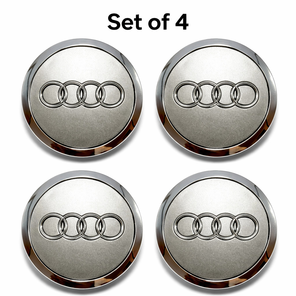 ## 69mm Audi Wheel Center Hub Caps – Silver – Set of 4 Upgrade or replace your worn or missing wheel center caps with this 69mm Audi-style center cap set. Designed with a clean silver finish and classic four-ring logo, these caps give your wheels a fresh OEM-style look. Perfect replacement for damaged, faded, or lost original caps. * * * ### Product Features • Set of 4 wheel center caps • Outer diameter: 69 mm (2.72 inches) • Silver finish with chrome rings • Durable ABS plastic construction • Snap-in clip design for secure fit • Direct replacement for many Audi wheels * * * ### Installation These caps feature snap-in clips on the back for quick and easy installation. Simply remove the old cap and press the new one firmly into place. * * * ### Compatibility Compatible with many Audi models including: Audi A3 Audi A4 Audi A5 Audi A6 Audi A7 Audi A8 Audi Q3 Audi Q5 Audi Q7 Audi TT Important: Fitment depends on the wheel design, not only the vehicle model. * * * ### Fitment Notice Please measure your original wheel center cap before purchasing. Required size: 69 mm / 2.72 inches (outer diameter) * * * ### Package Includes • 4 × Audi-style wheel center caps * * * ### Shipping Same Day Shipping Orders placed before 10 AM PT ship the same day Secure packaging and tracking provided.