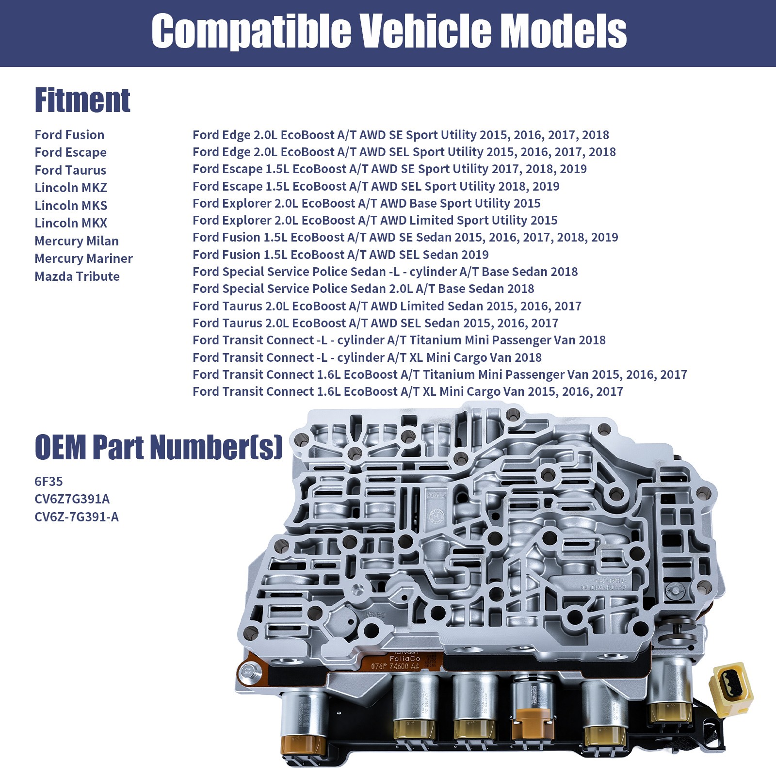 NEW-00006  FAST,FREE SHIPPING  AWESOME CUSTOMER SUPPORT  【Made of Premium Materials】Ensuring: Meet OE Performance Standards, Longer Service Life; Easy Installation. 【Remanufactured but each is upgraded with premium OEM parts】Our part is a high-quality remanufactured unit, passing through rigorous testing protocol and enhanced quality control which ensure its standout performance and reliability. **OEM Part Number(s):** 6F35 CV6Z7G391A CV6Z-7G391-A **Features:** ★ Compatibility is based on Ford OEM parts catalogs. ★ 2-year Warranty ★ Remanufactured valve body with brand new conductor board **Fitment:** Ford Edge 2.0L EcoBoost A/T AWD SE Sport Utility 2015, 2016, 2017, 2018 Ford Edge 2.0L EcoBoost A/T AWD SEL Sport Utility 2015, 2016, 2017, 2018 Ford Edge 2.0L EcoBoost A/T AWD Titanium Sport Utility 2015, 2016, 2017, 2018 Ford Edge 2.0L EcoBoost A/T FWD SE Sport Utility 2015, 2016, 2017, 2018 Ford Edge 2.0L EcoBoost A/T FWD SEL Sport Utility 2015, 2016, 2017, 2018 Ford Edge 2.0L EcoBoost A/T FWD Titanium Sport Utility 2015, 2016, 2017, 2018 Ford Edge 3.5L Duratec V6 A/T AWD SE Sport Utility 2016, 2017 Ford Edge 3.5L Duratec V6 A/T FWD SE Sport Utility 2016, 2017 Ford Escape 1.5L EcoBoost A/T AWD SE Sport Utility 2017, 2018, 2019 Ford Escape 1.5L EcoBoost A/T AWD SEL Sport Utility 2018, 2019 Ford Escape 1.5L EcoBoost A/T AWD Titanium Sport Utility 2017 Ford Escape 1.5L EcoBoost A/T FWD SE Sport Utility 2017, 2018, 2019 Ford Escape 1.5L EcoBoost A/T FWD SEL Sport Utility 2018, 2019 Ford Escape 1.5L EcoBoost A/T FWD Titanium Sport Utility 2017 Ford Escape 1.6L EcoBoost A/T AWD SE Sport Utility 2015, 2016 Ford Escape 1.6L EcoBoost A/T AWD Titanium Sport Utility 2015, 2016 Ford Escape 1.6L EcoBoost A/T FWD SE Sport Utility 2015, 2016 Ford Escape 1.6L EcoBoost A/T FWD Titanium Sport Utility 2015, 2016 Ford Escape 2.0L EcoBoost A/T AWD SE Sport Utility 2015, 2016, 2017, 2018, 2019 Ford Escape 2.0L EcoBoost A/T AWD SEL Sport Utility 2018, 2019 Ford Escape 2.0L EcoBoost A/T AWD Titanium Sport Utility 2015, 2016, 2017, 2018, 2019 Ford Escape 2.0L EcoBoost A/T FWD SE Sport Utility 2015, 2016, 2017, 2018, 2019 Ford Escape 2.0L EcoBoost A/T FWD SEL Sport Utility 2018, 2019 Ford Escape 2.0L EcoBoost A/T FWD Titanium Sport Utility 2015, 2016, 2017, 2018, 2019 Ford Escape 2.5L Duratec A/T AWD SE Sport Utility 2015, 2016 Ford Escape 2.5L Duratec A/T FWD S Sport Utility 2015, 2016, 2017, 2018, 2019 Ford Escape 2.5L Duratec A/T FWD SE Sport Utility 2015, 2016 Ford Explorer 2.0L EcoBoost A/T AWD Base Sport Utility 2015 Ford Explorer 2.0L EcoBoost A/T AWD Limited Sport Utility 2015 Ford Explorer 2.0L EcoBoost A/T AWD XLT Sport Utility 2015 Ford Explorer 2.0L EcoBoost A/T FWD Base Sport Utility 2015 Ford Explorer 2.0L EcoBoost A/T FWD Limited Sport Utility 2015 Ford Explorer 2.0L EcoBoost A/T FWD XLT Sport Utility 2015 Ford Explorer 2.3L EcoBoost A/T AWD Base Sport Utility 2016, 2017, 2018, 2019 Ford Explorer 2.3L EcoBoost A/T AWD Limited Sport Utility 2016, 2017, 2018, 2019 Ford Explorer 2.3L EcoBoost A/T AWD XLT Sport Utility 2016, 2017, 2018, 2019 Ford Explorer 2.3L EcoBoost A/T FWD Base Sport Utility 2016, 2017, 2018, 2019 Ford Explorer 2.3L EcoBoost A/T FWD Limited Sport Utility 2016, 2017, 2018, 2019 Ford Explorer 2.3L EcoBoost A/T FWD XLT Sport Utility 2016, 2017, 2018, 2019 Ford Fusion 1.5L EcoBoost A/T AWD SE Sedan 2015, 2016, 2017, 2018, 2019 Ford Fusion 1.5L EcoBoost A/T AWD SEL Sedan 2019 Ford Fusion 1.5L EcoBoost A/T FWD SE Sedan 2015, 2016, 2017, 2018, 2019 Ford Fusion 1.5L EcoBoost A/T FWD SEL Sedan 2019 Ford Fusion 1.6L EcoBoost A/T AWD SE Sedan 2015 Ford Fusion 1.6L EcoBoost A/T FWD SE Sedan 2015 Ford Fusion 2.0L EcoBoost A/T AWD Platinum Sedan 2017, 2018 Ford Fusion 2.0L EcoBoost A/T AWD SE Sedan 2015, 2016, 2017, 2018, 2019 Ford Fusion 2.0L EcoBoost A/T AWD SEL Sedan 2019 Ford Fusion 2.0L EcoBoost A/T AWD Titanium Sedan 2015, 2016, 2017, 2018, 2019 Ford Fusion 2.0L EcoBoost A/T FWD Platinum Sedan 2017, 2018 Ford Fusion 2.0L EcoBoost A/T FWD SE Sedan 2015, 2016, 2017, 2018, 2019 Ford Fusion 2.0L EcoBoost A/T FWD SEL Sedan 2019 Ford Fusion 2.0L EcoBoost A/T FWD Titanium Sedan 2015, 2016, 2017, 2018, 2019 Ford Fusion 2.5L i-VCT A/T AWD SE Sedan 2015, 2016, 2017, 2018, 2019 Ford Fusion 2.5L i-VCT A/T AWD SEL Sedan 2019 Ford Fusion 2.5L i-VCT A/T FWD S Sedan 2015, 2016, 2017, 2018, 2019 Ford Fusion 2.5L i-VCT A/T FWD SE Sedan 2015, 2016, 2017, 2018, 2019 Ford Fusion 2.5L i-VCT A/T FWD SEL Sedan 2019 Ford Fusion 2.5L i-VCT FLEX A/T AWD SE Sedan 2017, 2018, 2019 Ford Fusion 2.5L i-VCT FLEX A/T AWD SEL Sedan 2019 Ford Fusion 2.5L i-VCT FLEX A/T FWD S Sedan 2017, 2018, 2019 Ford Fusion 2.5L i-VCT FLEX A/T FWD SE Sedan 2017, 2018, 2019 Ford Fusion 2.5L i-VCT FLEX A/T FWD SEL Sedan 2019 Ford Special Service Police Sedan -L - cylinder A/T Base Sedan 2018 Ford Special Service Police Sedan 2.0L A/T Base Sedan 2018 Ford Special Service Police Sedan 2.0L EcoBoost A/T Base Sedan 2014, 2015, 2016, 2017 Ford Taurus 2.0L EcoBoost A/T AWD Limited Sedan 2015, 2016, 2017 Ford Taurus 2.0L EcoBoost A/T AWD SEL Sedan 2015, 2016, 2017 Ford Taurus 2.0L EcoBoost A/T FWD Limited Sedan 2015, 2016, 2017 Ford Taurus 2.0L EcoBoost A/T FWD SE Sedan 2015, 2016, 2017 Ford Taurus 2.0L EcoBoost A/T FWD SEL Sedan 2015, 2016, 2017 Ford Transit Connect -L - cylinder A/T Titanium Mini Passenger Van 2018 Ford Transit Connect -L - cylinder A/T XL Mini Cargo Van 2018 Ford Transit Connect -L - cylinder A/T XL Mini Passenger Van 2018 Ford Transit Connect -L - cylinder A/T XLT Mini Cargo Van 2018 Ford Transit Connect -L - cylinder A/T XLT Mini Passenger Van 2018 Ford Transit Connect 1.6L EcoBoost A/T Titanium Mini Passenger Van 2015, 2016, 2017 Ford Transit Connect 1.6L EcoBoost A/T XL Mini Cargo Van 2015, 2016, 2017 Ford Transit Connect 1.6L EcoBoost A/T XL Mini Passenger Van 2015, 2016, 2017 Ford Transit Connect 1.6L EcoBoost A/T XLT Mini Cargo Van 2015, 2016, 2017 Ford Transit Connect 1.6L EcoBoost A/T XLT Mini Passenger Va