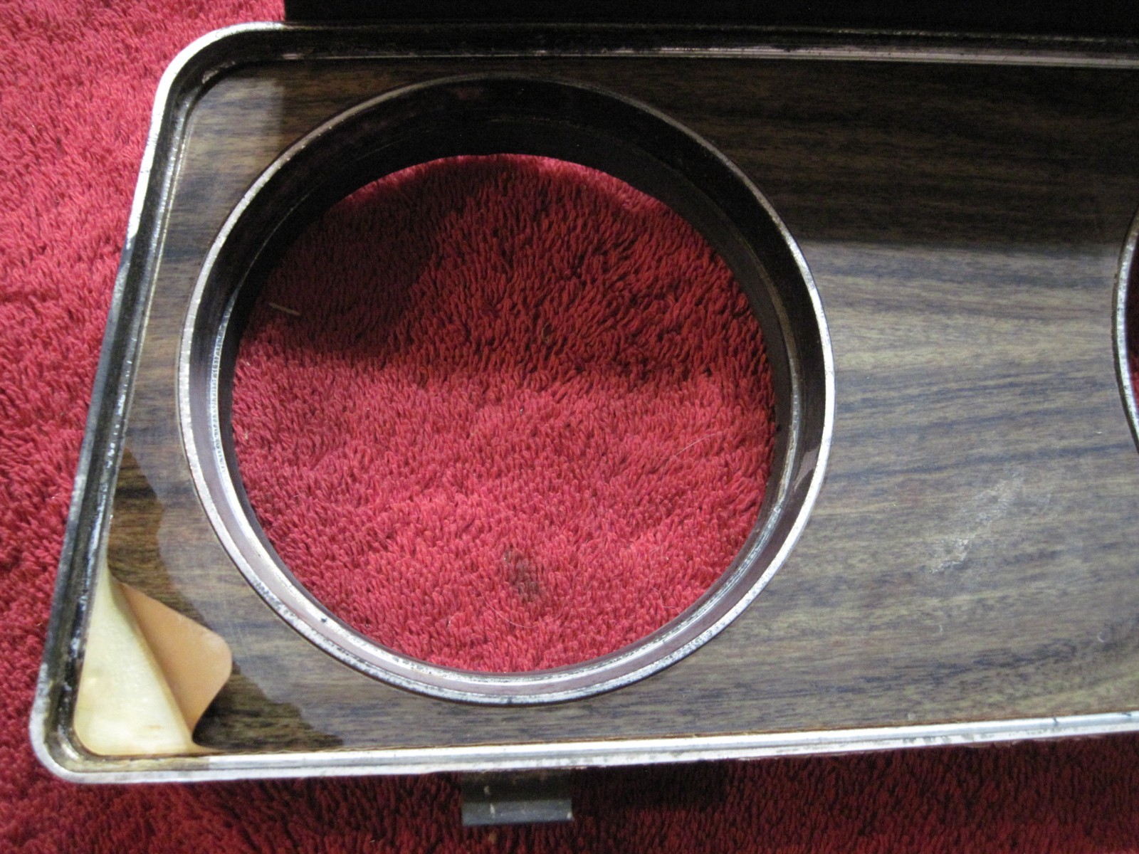 Wood grain gauge bezel from a 71 Cutlass Supreme. No cracks. Wood grain is peeling in the corners.