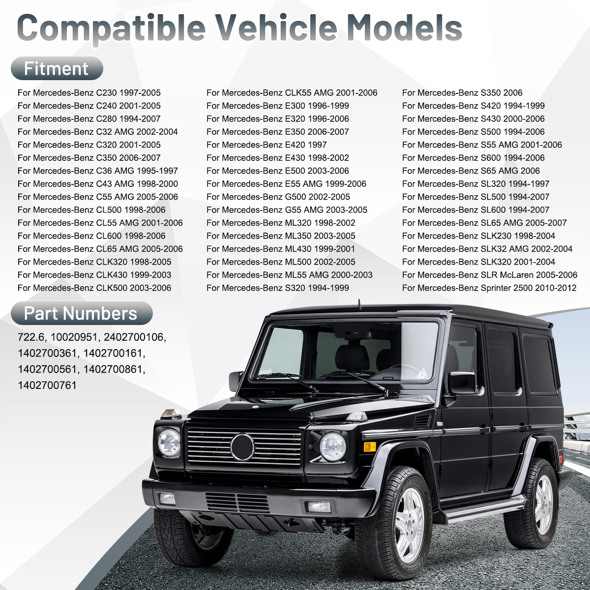 - OE/OEM Part Number: 10020951, 1402700161, 1402700361, 1402700561, 1402700761, 1402700861, 2402700106, 722.6