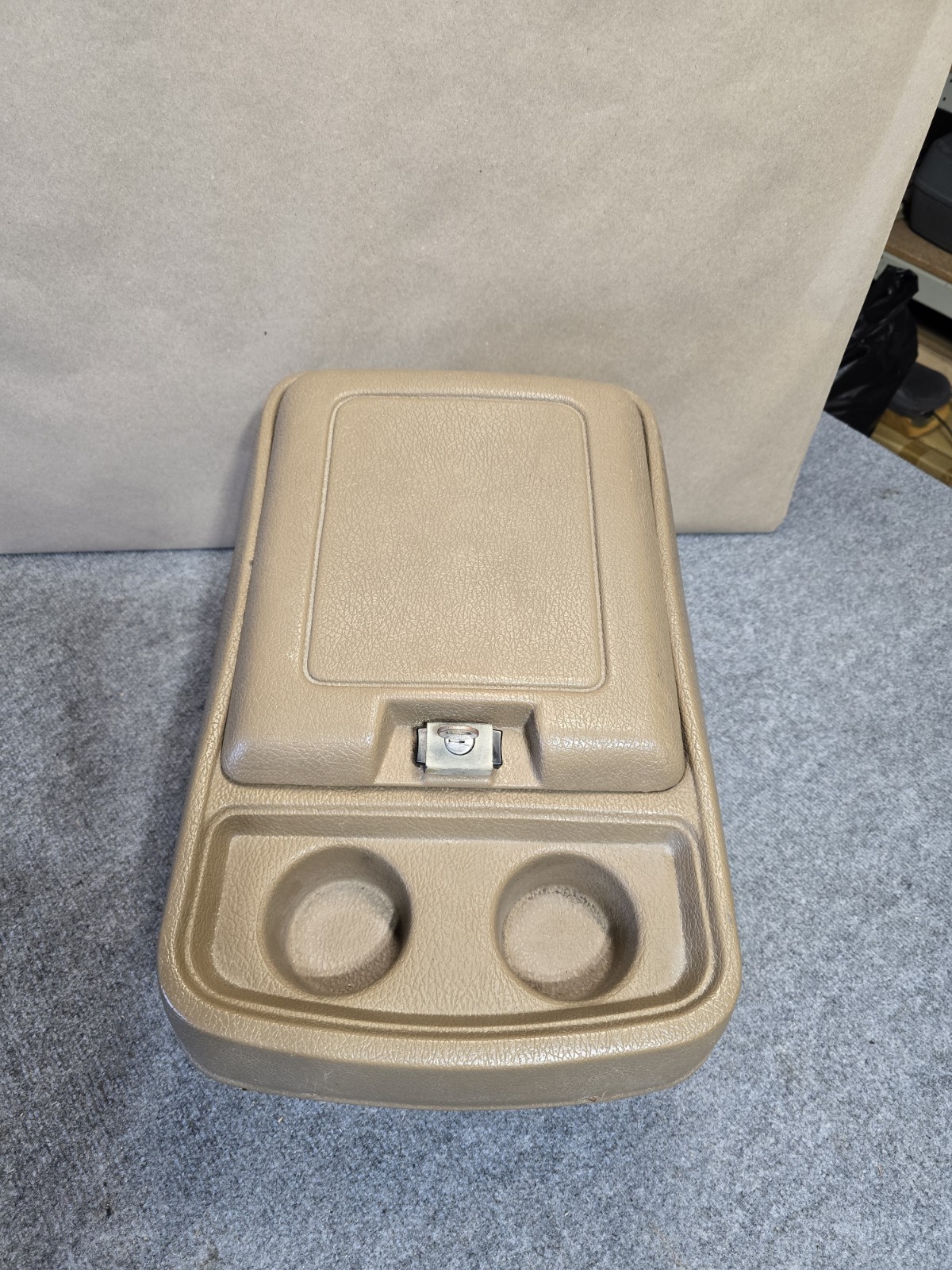 USED CENTER CONSOLE THIS ONE THE TAN COLOR HAS SOME SCUFFS, SCRATCHES AND STAINS IN THE CUPHOLDER SLOTS. THIS ONE IS SLIGHTLY BOWED IN, PROBABLY FROM A CHILD SITTING ON IT. THAT MAKES THE LATCH VERY TIGHT, YOU HAVE TO GIVE IT A GOOD BUMP TO MAKE IT CLOSE. SOME HEAT ON IT MAY BRING IT BACK, NOT SURE. HAS A COUPLE OF TINY HOLES IN THE FRONT. SEE ALL PICTURES AS THE SHORTCOMINGS ARE ALL POINTED OUT. 4 MOUNTING BOLTS INCLUDED , BUT THEY ARE RUSTY. LATCH WORKS AND INCLUDES A WORKING KEY !!!!!FEEDBACK!!!!! WHEN YOU RECEIVE YOUR PURCHASE AND ALL IS GOOD, PLEASE KINDLY LEAVE A POSITIVE FEEDBACK AND I'LL LEAVE ONE FOR YOU.