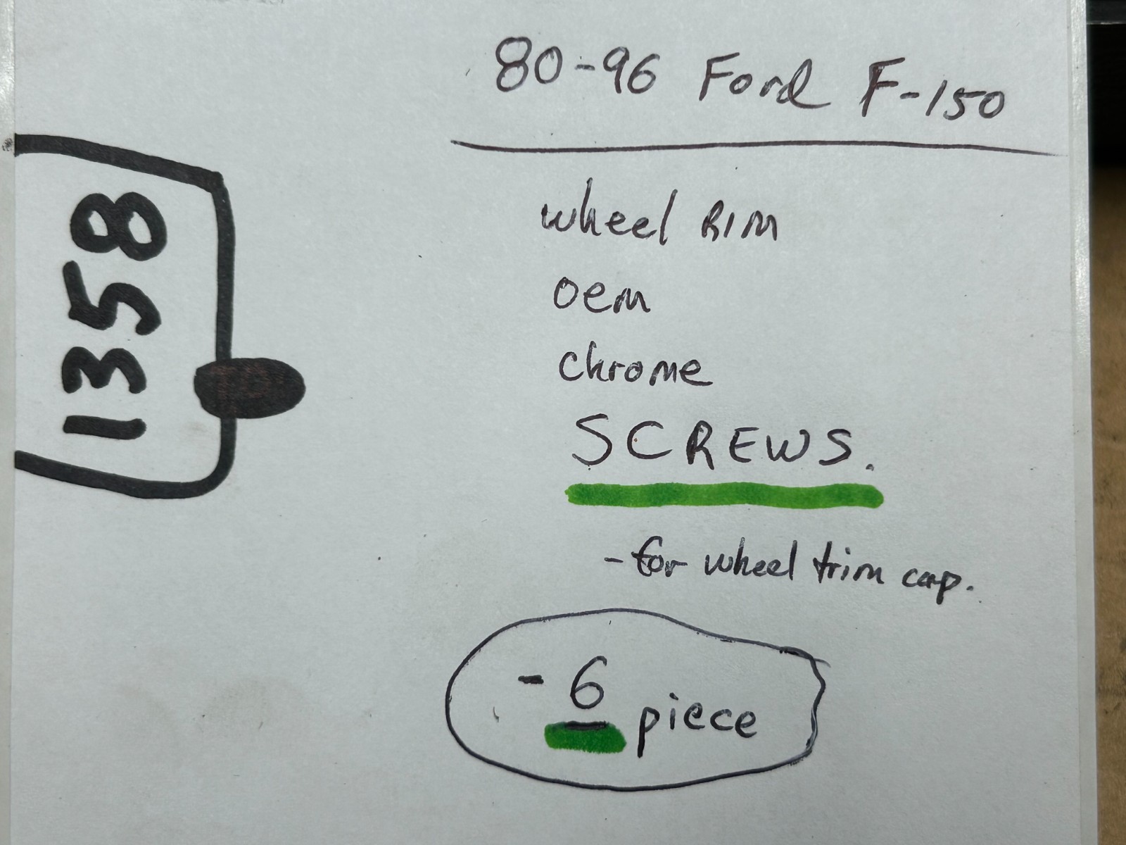 **6 pieces.** **OEM RIM/Wheel Cap SCREWS that are used to attach the center caps to the wheels for the 1980-1996 Ford F-150 and Bronco and 1992-1996 Van.** **This is for 6 pieces (6 screws), enough for all 2 wheel center caps.** There are multiple wheel options for each year, make and model. Please ensure these are the parts you want. We try to provide you with as much information as possible, please ask us if you have any questions or problems. We cannot be held responsible if you order the wrong part but do accept returns, please note the buyer pays for the return shipping. International buyers to pay actual shipping charge, no handling or package charges, we are not responsible for customs delays or fee's imposed on international shipments. Thank you!