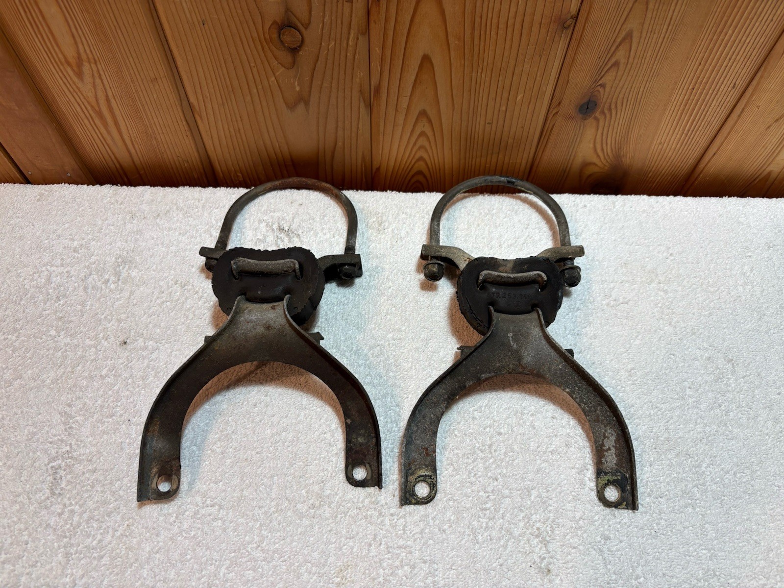 1983 1984 1985 Porsche 944 Converter Exhaust Hanger Mount Set of 2 Genuine OEM. Removed from a 1984 Porsche 944 NA. In great condition overall with no major damage and minimal cosmetic damage. There are no cracks, breaks, or major unwanted bends and the u bolts are in good shape. Additional Mounting Hardware is not included. Please confirm with a mechanic or Porsche Specialist/Dealer to ensure this part will fit your vehicle before purchasing. Buyer is responsible for correct fitment.