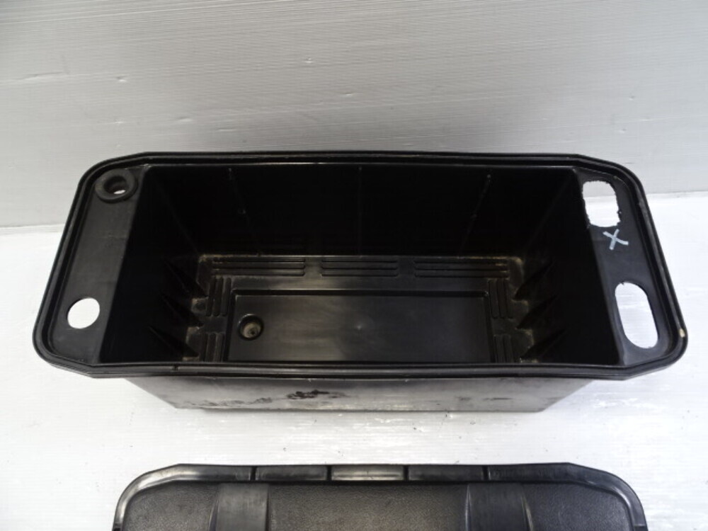 ## 83 Mercedes 380SL battery box tray 1078430005, 1078430105 - SKU: **DB133285** - Brand: **Mercedes-Benz** - Condition: **used** - Notes: **Lid has cracks marked with X. Housing has a hole cut out. See photos. ( #2 #3 ).** - Storage Location: **S8B05** - Donor Vehicle: **1983 Mercedes-Benz 380SL. Mileage: 187,901.** [
