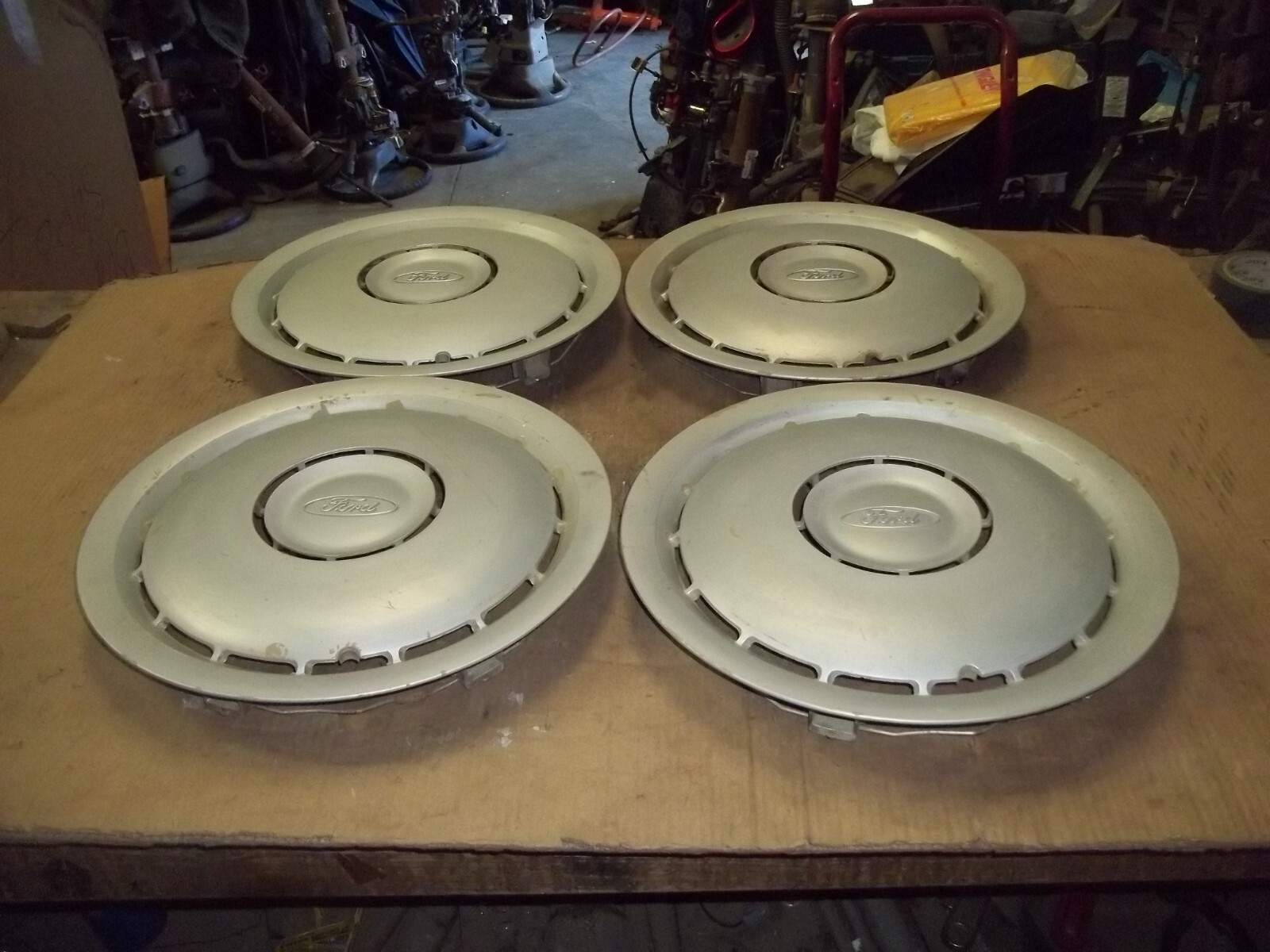 A set of FOUR (4) 86-89 Ford Taurus 14" factory full wheel covers.This is a good used set with MANY scratches / scrapes and marks.These scratches / scrapes and marks will be noticeable from even a short distance.One cover has a crack on face as pictured.The original silver finish is VERY faded and worn dull due to time.Oxidation and corrosion.Staining that does not polish away.Paint peeling.Silver finish different shades.All mounting clips in good working order.Poor driver car quality.On a scale from 1 to 10, these rate a "5" in condition.Buyer to pay shipping with a flat rate of $25 within the continental U.S..Elsewhere there are additional charges.Accept most methods of payment.California buyer to pay state sales tax.