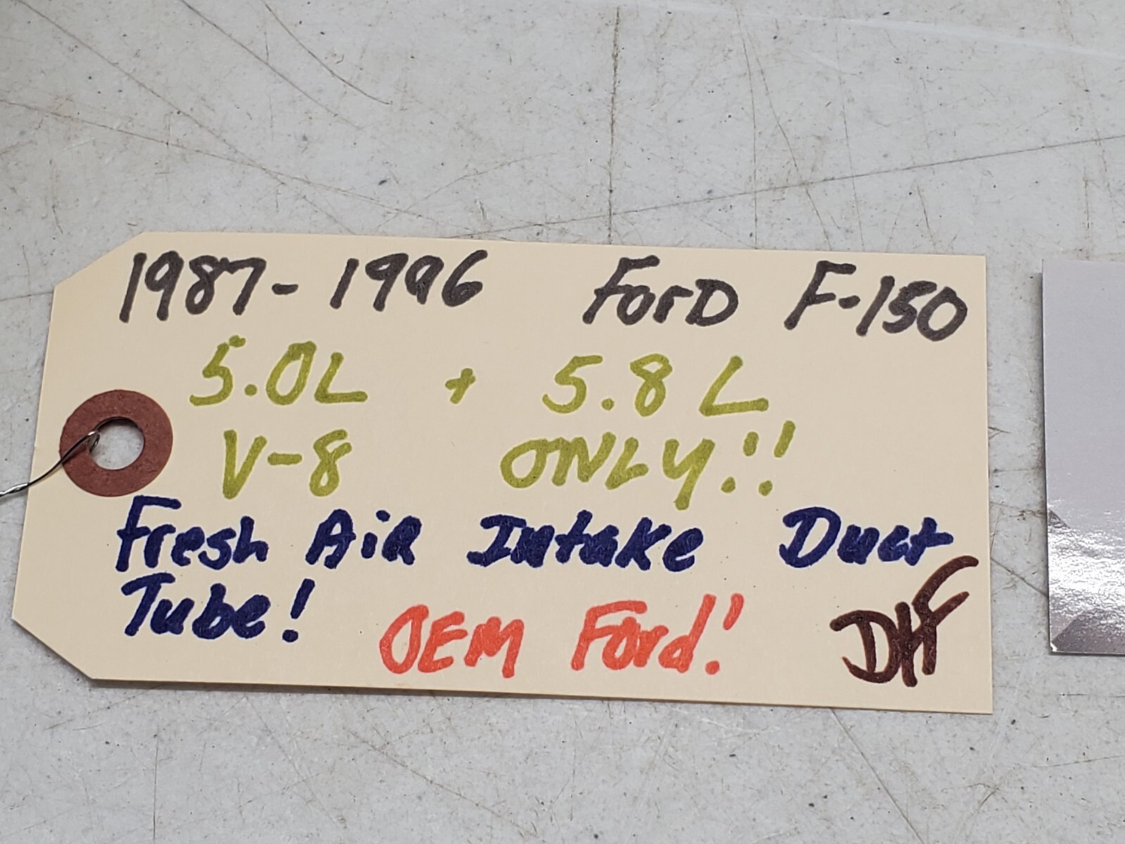 1987 thru 1996 Ford F-150 5.0 and 5.8 V-8 engine fresh air intake tube / Duct. This is a 2 piece assembly. Fresh air enters the top piece and then enters into the bottom of they air cleaner! Nice OEM Ford used part!