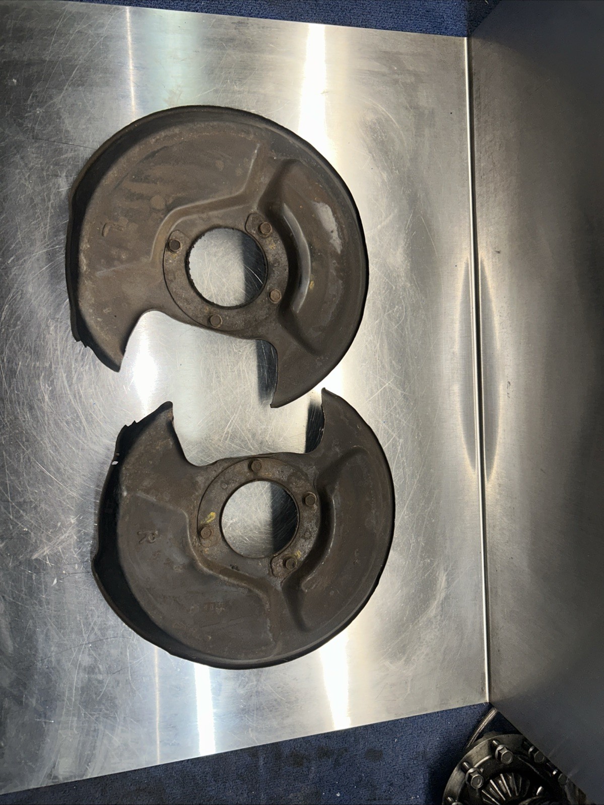 1988-91 Honda Civic and CRX REAR disc brake backing plates with hardware. Both items are in good condition with no damage. Very little rust.