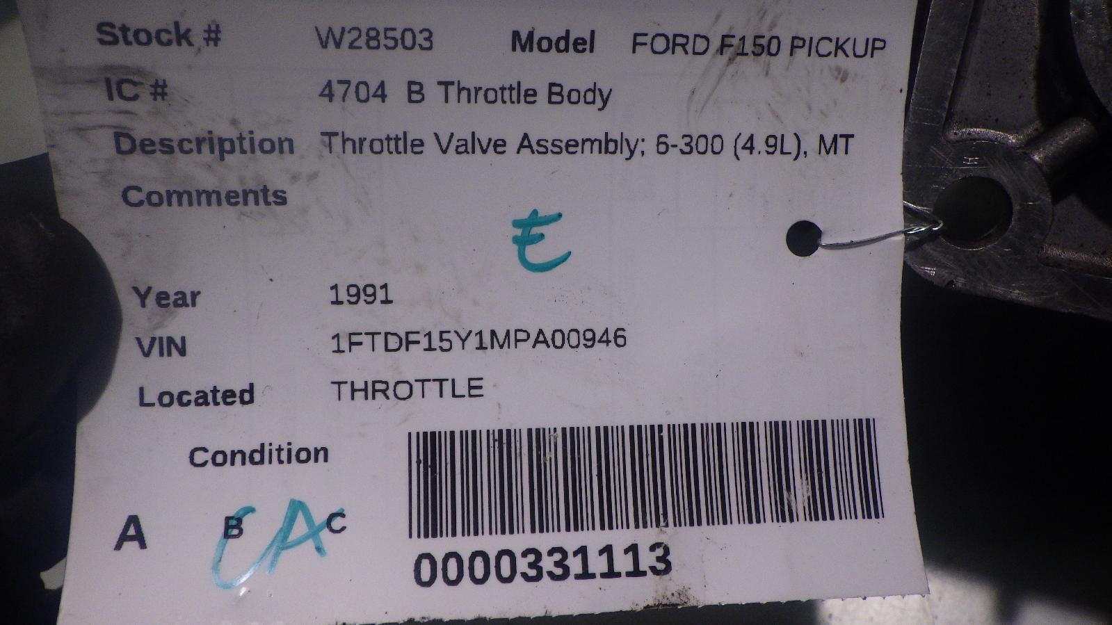 # FORD F150 PICKUP1991 ### IF YOU ARE FROM ALASKA, HAWAII, PUERTO RICO YOU MUST REQUEST A SHIPPING QUOTE. STANDARD SHIPPING DOES NOT APPLY TO YOU. ## Item Details Make / ModelFORD FORD F150 PICKUPYear1991Stock NumberW28503VIN1FTDF15Y1MPA00946Odometer0 Miles km ## Part also fits BRONCO1991 \- 1991Throttle Valve Assembly; 6-300 (4.9L), MT FORD F150 PICKUP1991 \- 1991Throttle Valve Assembly; 6-300 (4.9L), MT FORD F250 PICKUP1991 \- 1991Throttle Valve Assembly; 6-300 (4.9L), MT FORD F350 PICKUP1991 \- 1991Throttle Valve Assembly; 6-300 (4.9L), MT FORD E350 VAN1991 \- 19916-300 (4.9L), MT ## General Information and Conditions - West Coast Auto - Feel free to contact us in regards to any purchase or if you simply need more INFO ## Shipping and Handling - Ship To Locations Our default shipping rates are for the 48 US states only via UPS Ground or USPS. At an extra charge, Alaska , Hawaii , APO, FPO, Puerto Rico and all US Territories will be sent via USPS Priority Mail. At an extra charge, we will also ship items World Wide International via USPS International Priority mail. Depending on which country you are in, you may need to contact us for a shipping quote before or after purchase to complete the sale. We usually ship within 1-2 business days of receiving cleared payment. Unless otherwise noted, Buyer pays shipping. Freight Items We will not ship freight items and some larger or fragile parts outside of the 48 US states. For large items that must be shipped via Freight Truck (i.e. engines, transmissions, doors, trunks, hoods...etc), the delivery site must be a commercially zoned address capable of unloading a freight truck. Home businesses, churches, military bases, schools, and self storage units cannot be delivered to. We can also arrange for you to pick up your freight item at your local freight terminal. For an accurate residential freight quote, please contact us before your purchase. If for some reason our shipping cost is greatly over this estimate, we reserve the right to ask for additional funds or an alternate ship to address. Shipping Deadlines We will process every order within 24 hours of checkout. Our business hours are from 8-5 M-F PST. Orders placed after 1:00 pm PST cannot be guaranteed shipping that day. All Non-Freight items will be sent via UPS or USPS ground unless given instruction otherwise. If you need 2nd day air or Next day air service please call us directly for best results. You may also add this service during checkout but we can only guarantee shipment of these orders if it is placed before 1:00 PST. All freight items will go out the same day if pulled and the order is placed before 12:00 noon PST. This is providing that we have adequate payment, shipping instructions and phone numbers to process the shipment. ## Payment - We accept Pay Pal, or most major credit cards. If you want to use a personal credit card you can pay through our checkout or please Google us to contact us, 8-5 PST M-F By law, we charge sales tax for items shipped to these states(CALIFORNIA): (8.00%). Tax applies to the subtotal plus any shipping and handling for these states only. No labor warranty is provided. In the event a part sold with a warranty fails to operate within the warranty period we will replace the part(s) with a functionally equivalent part or refund the part purchase price, at our option. No refund on deposits or unwanted special order parts or special "cut" items. To return an item you must contact us within the 14 day period to obtain a RMA number (return material authorization). Original shipping charges and return shipping charges are not refunded. Once you obtain an RMA number, ship the item back to WEST COAST AUTO DISMANTLING, (Google us for info) along with the RMA number. - Parts Covered by Warranty – in case the part sold fails to work due to defective material or wrong fitment, we will replace the part or issue a full refund (our choice) up to the cost of the part purchased price (no refunds for labor costs), see warranty tab in the listing for more details. - Items NOT Covered by Warranty - For parts that are not defective, but are returned, the following will apply: 20% Restocking Fee, shipping costs are not refunded, and customer pays for shipping the part back ## Item Location and Contact Information West Coast Auto Dismantling