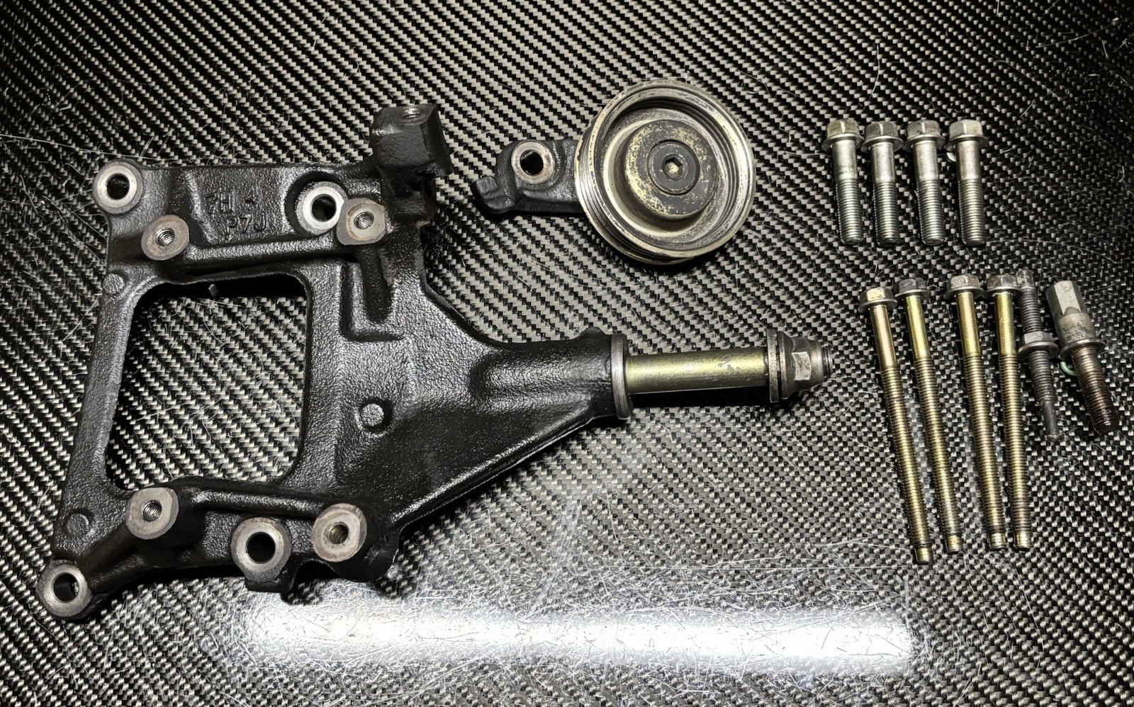 OEM Honda ‘P7J’ A/C Bracket. Removed from: 97-01 Honda CR-V B20b/ B20z engine Commonly used on B-Series engine swaps into 92-00 Honda Civics to retain the factory A/C unit. Comes with the OEM mounting hardware shown. Stock photo used from our inventory. Item is used. Item is in good working condition. Please research fitment before purchase.