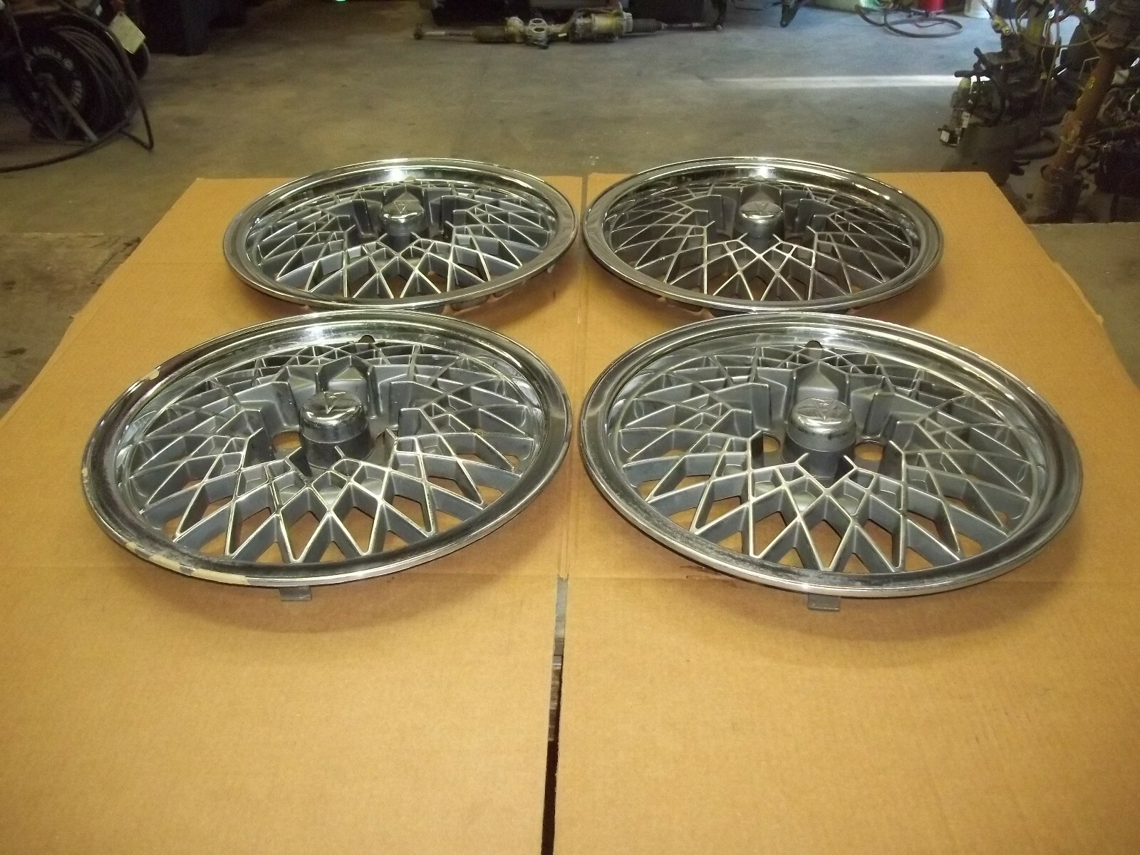 A set of FOUR (4) 92-94 Pontiac Grand Am and 92 -94 Sunbird 15" factory full wheel covers.Factory lug nuts and retaining caps will be needed to attach to wheels.This is a used set with MANY deep scratches / scrapes and marks.These scratches / scrapes and marks will be noticeable from even a short distance.Entire outer edges curb damaged.The original finish is VERY faded and worn due to time.Oxidation and pitting on chrome.Chrome lifting and peeling.Finish faded different shades.On a scale from 1 to 10, these rate a "5" in condition.Buyer to shipping with a flat rate of $25 within the continental U.S..Elsewhere there are additional charges.Accept most methods of payment.California buyer to pay state sales tax.