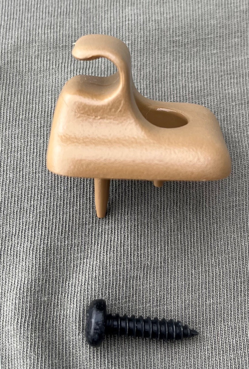 **Sun visor bracket/clip for Jeep Grand Cherokee** **(Jeep ZJ), years 93-98.Will also fit** **Dodge Ram 94-01.** **The official Jeep/Chrysler color of this sunvisor bracket is Saddle. If I were describing it, I’d call it Peanut Butter.** **This Saddle color was used primarily on 96, 97 and 98 ZJs.** **Mopar part # is 5EZ92ST6.** **THIS AD IS FOR ONE CLIP. Multiple clips shown in the ad pics because** **of the difficulty in determining true color from a picture on a screen. I took pics at different angles, in natural** **sunlight, to show actual colors to the buyer.** **I have multiples of these, so pics are representative, but ALL are in** **excellent condition. CAUTION! lol. Mine are real deal factory Mopar OE parts. The color will be** **correct and they will last. Great replacement for this commonly broken** **part. Also included, one OE Torx head mounting screw. Please** **see my other ads for different color Jeep ZJ sun visor clips: Mist Gray (light gray), Quartz (medium gray), Driftwood (beige), Agate (dark gray/black) and Champagne (khaki).**
