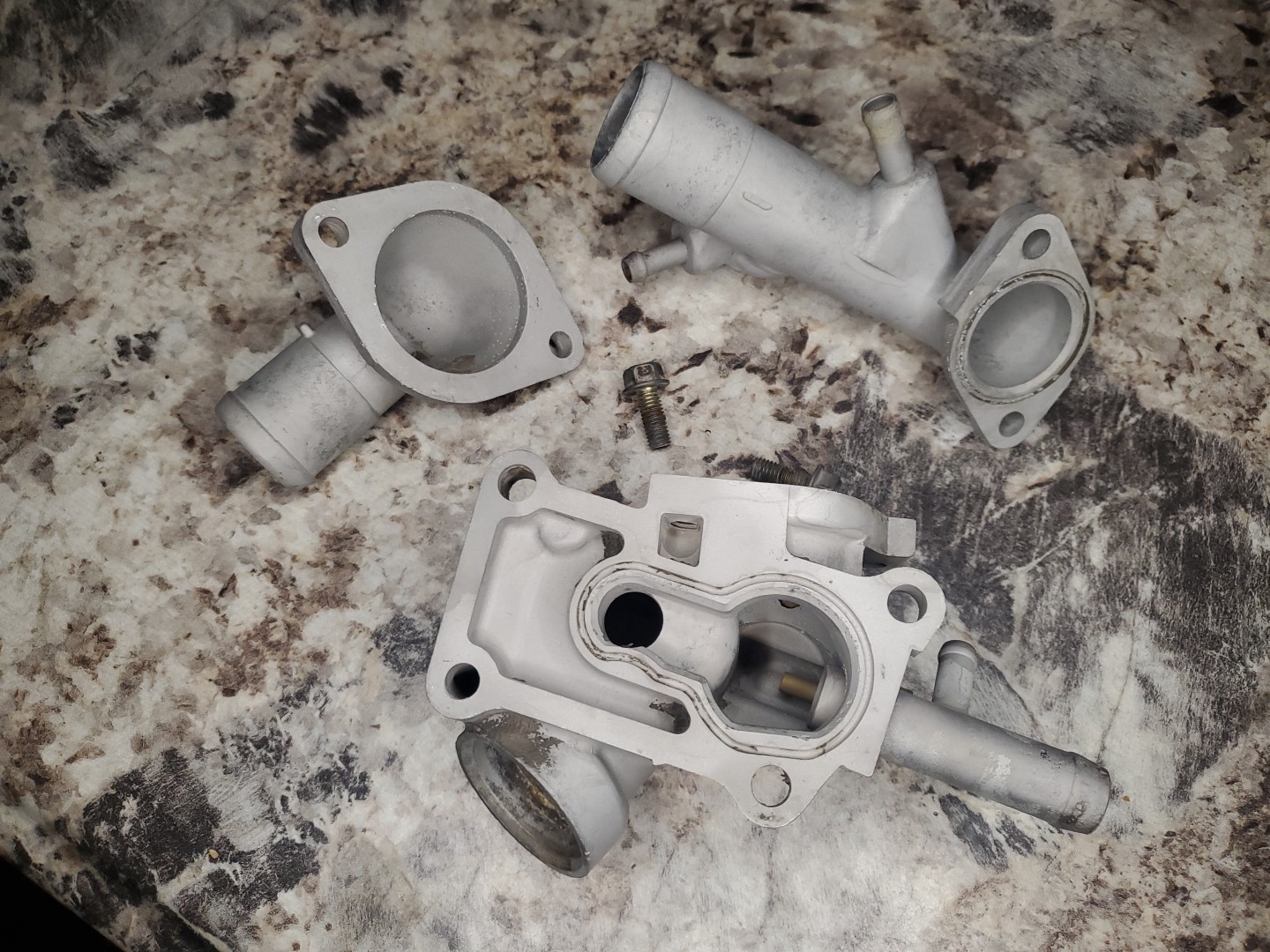 2g 4g63 Thermostat Housing. IT HAS BEEN SAND BLASTED. I was going to powder coat it but never got around to it. It would need to be blasted or cleaned a little bit more before powder coating. The nice part is you can see if there is any pitting on the water necks once these are blasted and there is only a tiny amount on the lower neck. Sensor are included but not guarenteed to work. Only have 2 of the 4 bolts to bolt the necks to the main body.