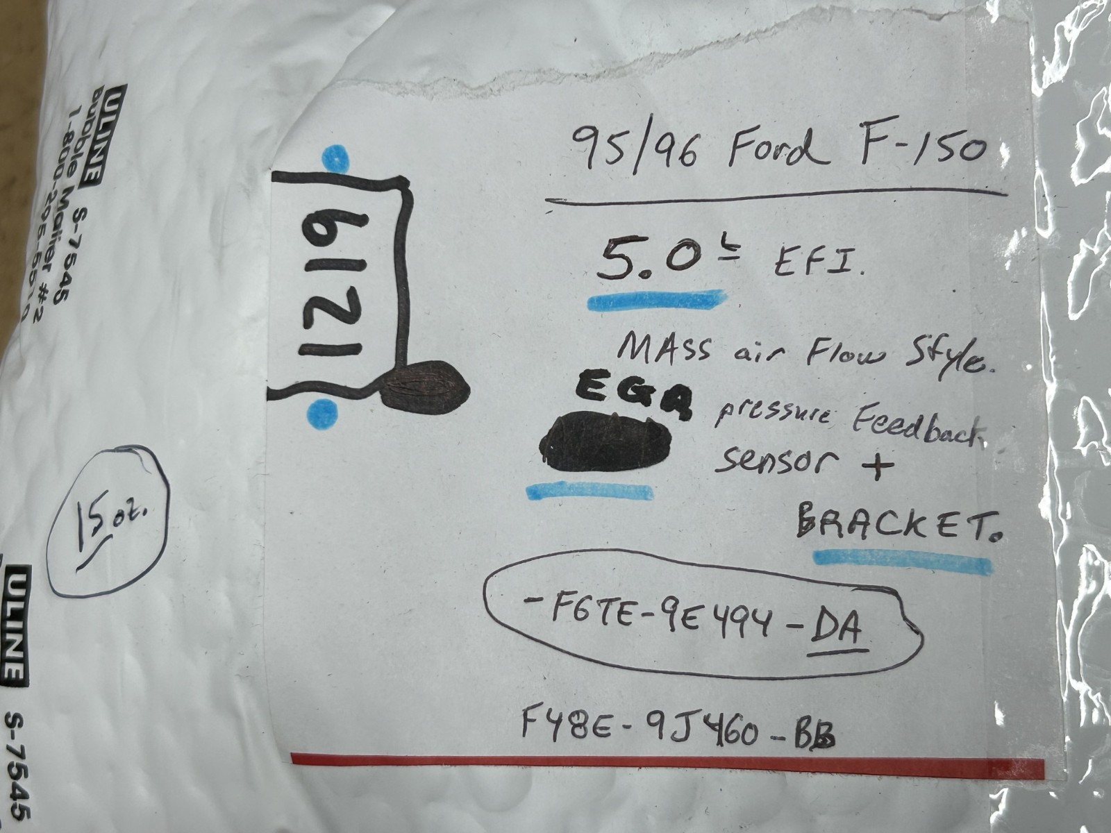 **1996 Ford F-150 5.0 EGR PRESSURE FEEDBACK SENSOR AND BRACKET** **PART NUMBER ON SENSOR:****F48E-9J460-BB** **PART NUMBER ON BRACKET:** **F6TE-9E494-DA** Off a 5.0L efi mass air flow / automatic truck. Good working condition. Includes the mounting bracket. OFF A 1996 FORD F150 WITH A 5.0 / AUTOMATIC and MASS AIR FLOW sensor.