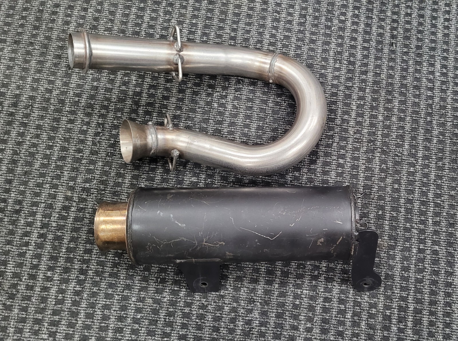 Header pipe never used, muffler could use some paint, does not have hardware, shipping what is pictured!