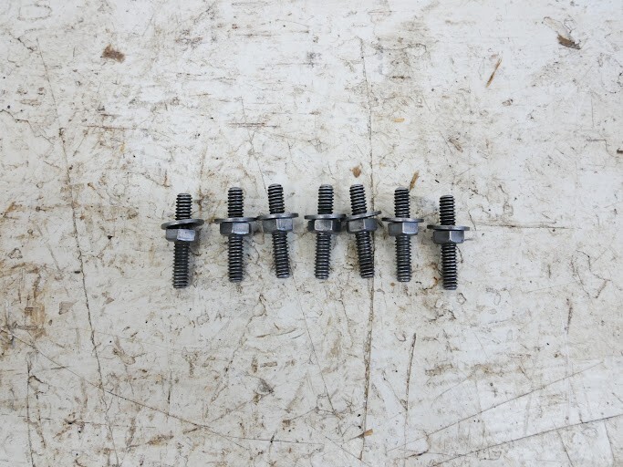 USED JEEP XJ OIL PAN BOLTS. THERE ARE 7 BOLTS TOTAL. THEY ARE JUST THE DOUBLE THREADED ONES. THEY HAVE BEEN CLEANED AND COULD BE USED FOR MULTIPLE APPLICATIONS. PLEASE SEE PICTURES AND ASK ANY QUESTIONS NEEDED. **ALL PART RETURNS ARE SUBJECT TO A 20% RESTOCKING FEE**
