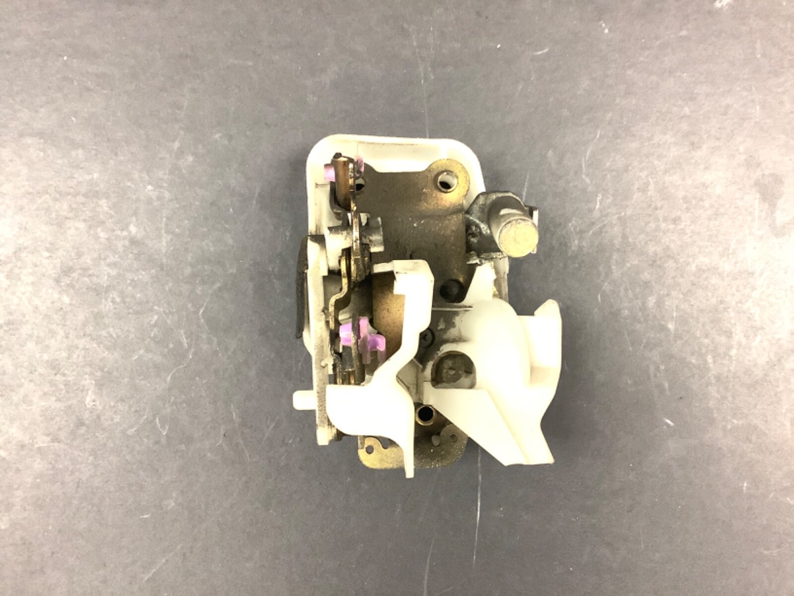 Left, driver side rear door latch assembly, manual lock type, used, OEM.