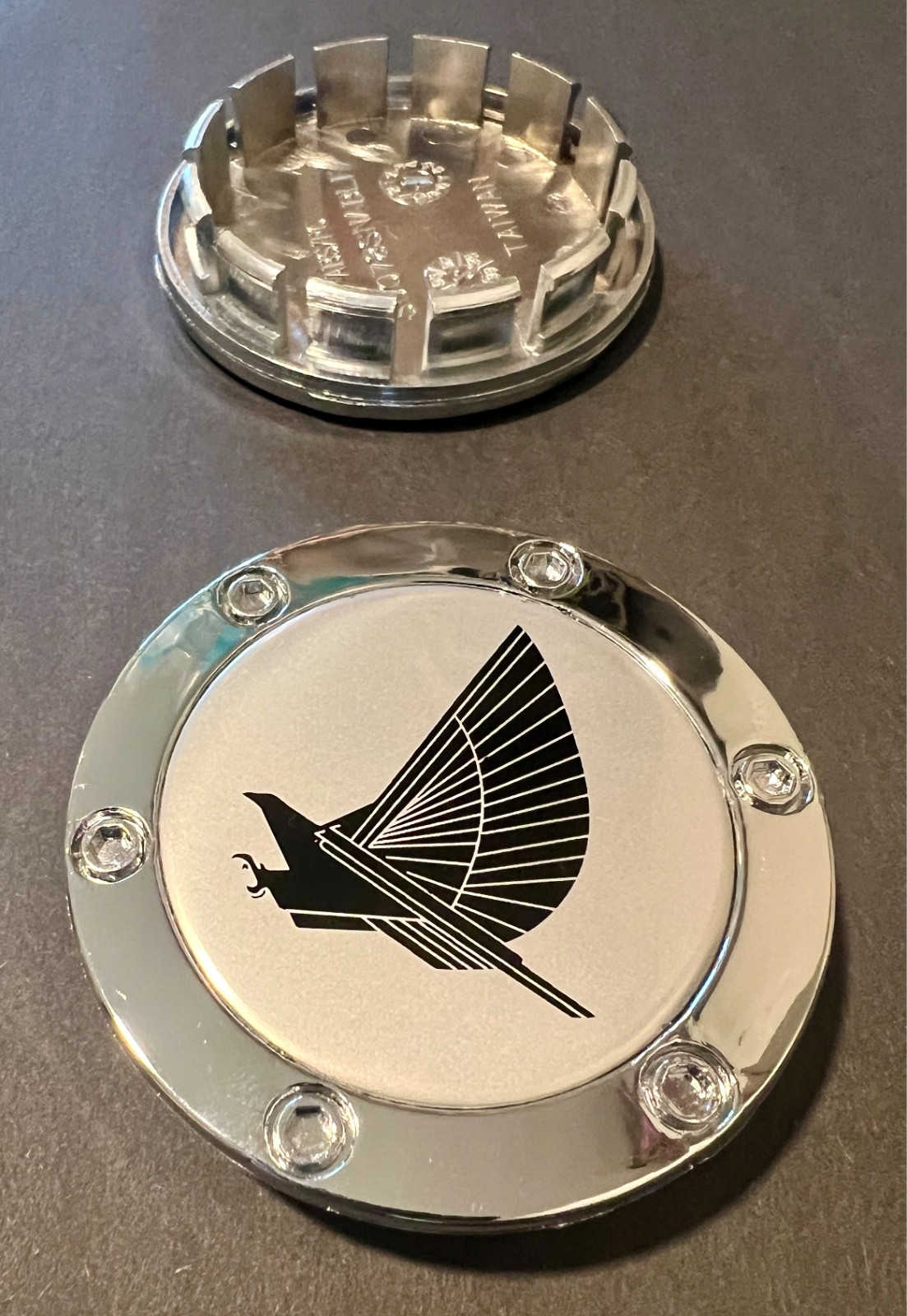 Old centercaps are prone to fail...tabs break and elements wear out the part. This highly reviewed set of (4) reproduction centercaps will replace missing, faded or broken centercaps. The fitment is excellent as can be seen in the photo. The chrome ABS plastic cap with aluminum face shield measures 3" in diameter and will fit Firehaw k rims from 98-02. The caps are new in a sealed sleeve.