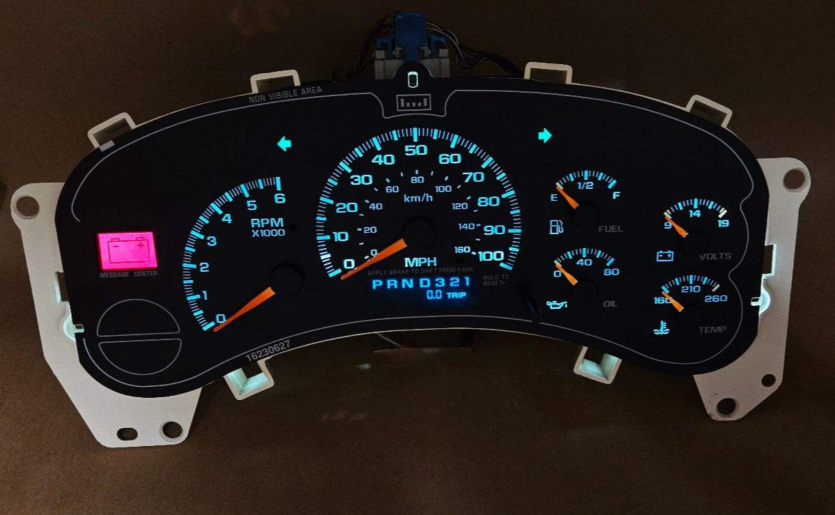 # 1999-2002 GM / CHEVROLET TRUCK # INSTRUMENT GAUGE CLUSTER ## ****WILL PROGRAM THE MILES TO YOUR NEED********AFTER YOUR PURCHASE SEND US A MESSAGE WITH THE MILES YOU NEED THE CLUSTER TO HAVE.**** > > ******CORE RETURN****** > > > > >Please note that we required your old cluster to be return, AFTER you have received this one. > > > > >We will provide/include a FREE PAID return shipping label. # Rebuilt Refurbished used Instrument Cluster > # ****\# ****FOR SALE IS A TRUCK INSTRUMENT CLUSTER.**** ****THIS CLUSTER IS A GREAT REPLACEMENT**** ****FOR YOUR BROKEN OR NON FUNCTIONAL CLUSTER CURRENTLY IN YOU TRUCK******** ****HERE IS WHAT YOU WILL GET WITH THIS REBUILT INSTRUMENT CLUSTER:**** 1. ALL BRAND NEW **COOL WHITE** LED BACKLIGHTING INSTALLED 2. ALL UPDATED ORANGE POINTERS 3. ALL GAUGES RE-CALIBRATED 4. POWER SUPPLY WORKING 5. LCD DISPLAY "**PRND321**" UPDATED AND WORKING 6. 5year WARRANTY 7. - LET US KNOW THE EXACT MODEL AND YEAR OF YOUR TRUCK. More Details **:** Please be aware that the cluster lens is not included. **Q. How Fast do you ship?** - A. We Ship out Orders Daily, Normally orders ship out with in 1-2 Days .We ship Monday-Friday, Orders Ship out via UPS or U.S Mail. **Q. How do I let you know how many** **miles I need on the cluster?** - A. When you are checking out the order, there is an option "notes to seller", click there and put your info (miles, year & if you have a core) in the indicated space. If there is any more questions or concerns please message us.