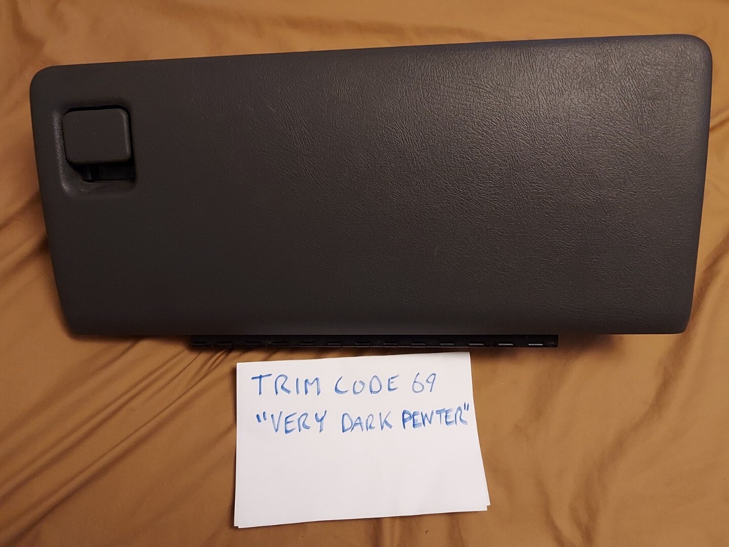 **FITS 1999 2000 2001 2002 2003 2004 2005 2006** CHEVROLET SILVERADO,AVALANCHE OR GMC SIERRA **& 2007 "CLASSIC" GMC SIERRA AND CHEVROLET** **SILVERADO.** **GLOVE BOX DOOR, USED,**69 **INTERIOR CODE**69 VERY DARK PEWTER ( DARK GREY ) \*\*STOCK PHOTOS, WE SELL MANY OF THESE OFTEN\*\* ( THIS IS THE WRONG COLOR FOR SUV'S) \*\*THIS LISTING IS FOR THE DOOR AND HINGE ONLY. THIS DOES NOT INCLUDE THE DOOR FRAME.\*\* WE DO SELL THE FRAME SEPARATELY. WE ALSO SELL THE COMPLETE ASSEMBLY. ( \*\*\*LOOK FOR THIS CODE ON YOUR GLOVE BOX DOOR DECAL\*\*\* ) FITS 1999 2000 2001 2002 2003 2004 2005 2006 & 2007 "CLASSIC" GMC SIERRA AND CHEVROLET SILVERADO. \*\*THIS IS USED, NOT NEW. SHOWS WEAR AND SCRATCHES CONSISTENT WITH A 20 YEAR OLD GLOVE BOX DOOR\*\* PLEASE CHECK YOUR INTERIOR TRIM CODE LOCATED ON YOUR GLOVE BOX DECAL!!! YOU ARE RESPONSIBLE FOR ORDERING THE CORRECT MATCHING TRIM CODE. \*CHECK OUR OTHER LISTINGS FOR 92/922 LIGHT GREY, 52 (TAN) or i52 SHALE COLORS\* IF YOU ARE UNSURE OF FITMENT, PLEASE MESSAGE US.