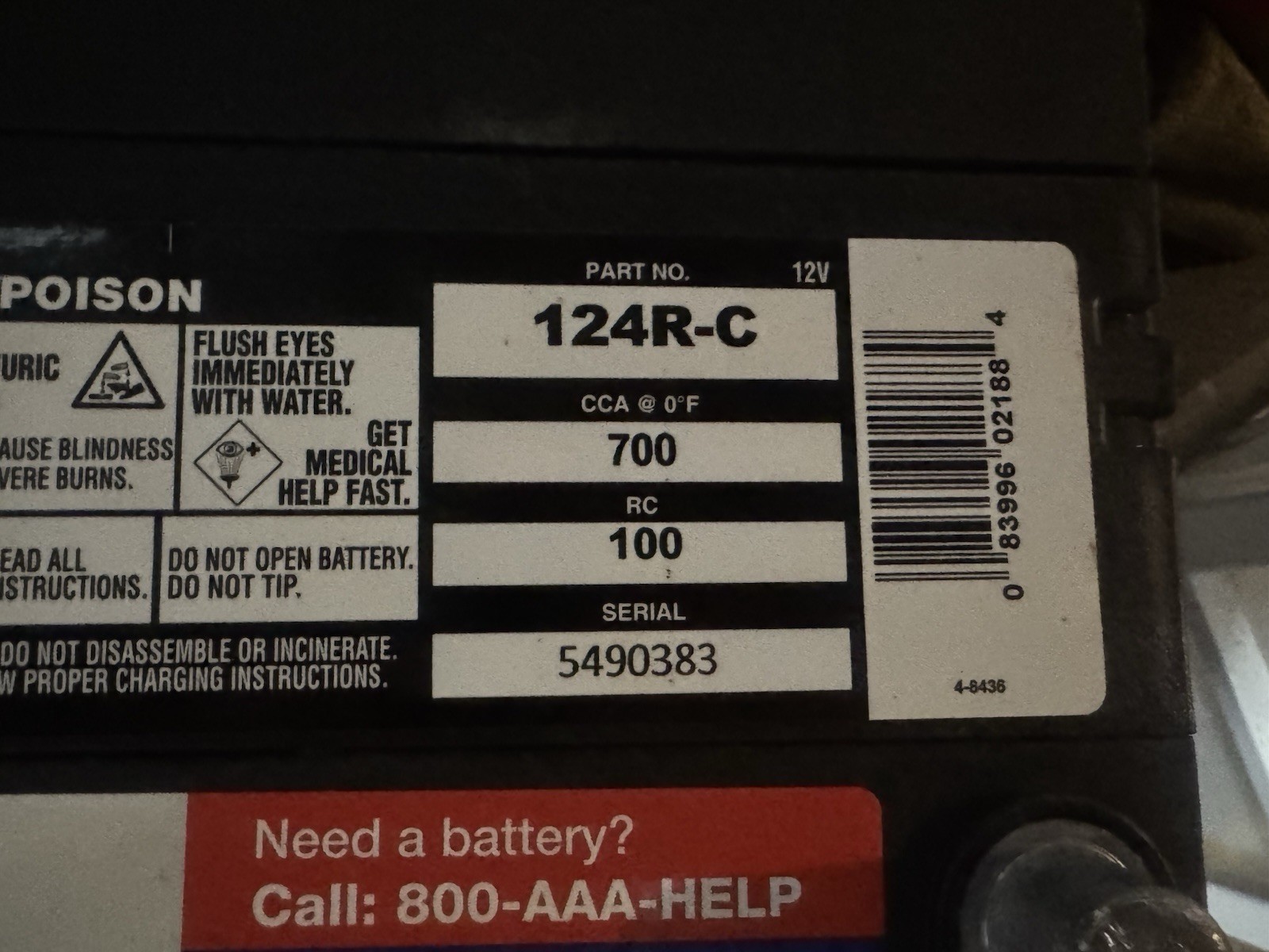 AAA 124R Battery . 700ccas 3/25 Sticker