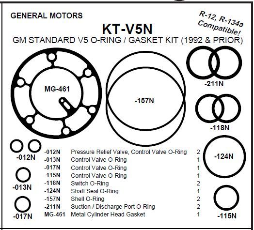 **PLEASE NOTE:** **THESE ARE BRAND NEW AC PARTS!** **\\_\\_\\_\_\_\_\_\_\_\_\_\_\_\_\_\_\_\_\_\_\_\_\_\_\_\_\_\_\_\_\_\_\_\_\_\_\_\_\_\_\_\_\_\_\_\_\_\_\_\_\_\_\_\_\_\_\_\_\_\_\_\_\_\_\_\_\_\_\_\_\_\_\_\_\_\_\_\_\_\_\_\_\_\_\_\_\_\_\_\_\_\_\_\_\_\_\_\_\_\_\_\_\_\_\_\_** **Made by** **Sunair Products** **1 GM V5 GASKET SET** **AND** **2 GM V5 5/8" THIN "SEALING WASHERS"** **AND** **1 GM V5 3/4" THIN "SEALING WASHERS"** **You are buying 1 GM V5 Compressor Gasket Set, 2 5/8" thin sealing washers, and 1 3/4" thin sealing washer.** **(The "sealing washers" go where the manifold hose assembly connects to the compressor)** **These are Premium Neoprene** **o-ringgasket & seal kits. High quality o-rings as needed for R-134a High Temperature useage.** **Features & Benefits: Sunair Products Seals are manufactured from the highest quaility material and are compatible with R12 and R134a.** **_\*Don't buy lower quality BLACK Nitrile o-rings or gaskets from other sellers.\*_** **A/C Compressor Gasket Kit with Neoprene** **o-rings fits:** **GM V5 compressors, Harrison V5 compressors** **\*\*Kit includes 4 o-rings for the V5 Control Valve\*\*** Torque Specs: V5 compressor through bolts torque spec: 8 to 10 nm (newton metre) = 72 to 84 INCH lbs (NOT foot lbs)=6 to 7 Foot lbs \*Progressively torque through bolts to 72 to 84 INCH lbs in an alternating pattern\* Compressor crankcase bolt (drain plug) 20 NM = 15 Foot lbs Manifold Hose Assembly to Compressor Mounting Bolt 33 NM = 24 Foot lbs Compressor Shaft Nut 12 Foot lbs Clutch Hub Air Gap (free space between clutch hub & pulley) .015" to .020" of an inch **Here are some web links showing a V5 compressor being reseal-** **Video Link showing a V5 Compressor being RESEALED (Video is made by one of my customers):** **[https://www.youtube.com/watch?v=X-mDBudWESE](https://www.youtube.com/watch?v=X-mDBudWESE)** **V5 Compressor Shaft Seal Installation Tips:** [**https://www.youtube.com/watch?v=YuItapsCDcw**](https://www.youtube.com/watch?v=YuItapsCDcw) **https://www.youtube.com/watch?v=X-mDBudWESE** PLEASE NOTE: ALL PICTURES ARE OF THE EXACT SEAL. IT IS IMPORTANT TO LOOK AT THE SEAL YOU ARE REMOVING AND CALL IF YOU HAVE ANY QUESTIONS AT ALL! VISUAL COMPARISON IS REQUIRED. MANY SEALS FIT MORE THAN ONE COMPRESSOR AND MANY COMPRESSORS HAVE MORE THAN 1 SEAL THAT IS USED. SEALS ORDERED INCORRECTLY WILL HAVE TO BE RETURNED AT YOUR OWN COST. Visual comparison required! The rubber mount seal can be bought & shipped with this gasket set at an OPTIONAL ADDED COST. Just don't pay the invoice until we have added the requested rubber mount seal for you. The rubber mount seal is not as popular as the regular metal single lip and double lip seals. \*\*\*\* We have NEW GM Seal Protectors as REQUIRED for installation of GM shaft seals also available for sale. The Mastercool part number is 90484. A shaft seal Protector is REQUIREDfor GM Teflon compressor shaft seal installation. The tool protects, EXPANDS, and STRETCHES the Teflon(Plastic) Lip seal to install the seal. Without the tool you WILL damage the new shaft seal by improperly installing it. The Shaft seal protector is REQUIRED if you are to install a seal without damaging the new seal. Without the tool how will you expand the Teflon Lip seal to install it? Teflon seals are not like rubber seals. Teflon seal are actually manufactured with a smaller inside diameter than the actual compressor shaft. That is why you MUST use this tool to properly install the new seal. Buyers in ContinentalUSA (including Alaska & Hawaii) get FREE shipping via USPS First Class Mail shipping, handling, and packing materials cost. No sales outside Continental USA. (except Alaska & Hawaii) No sales to APO/FPO addresses. No exceptions, No excuses, PERIOD!