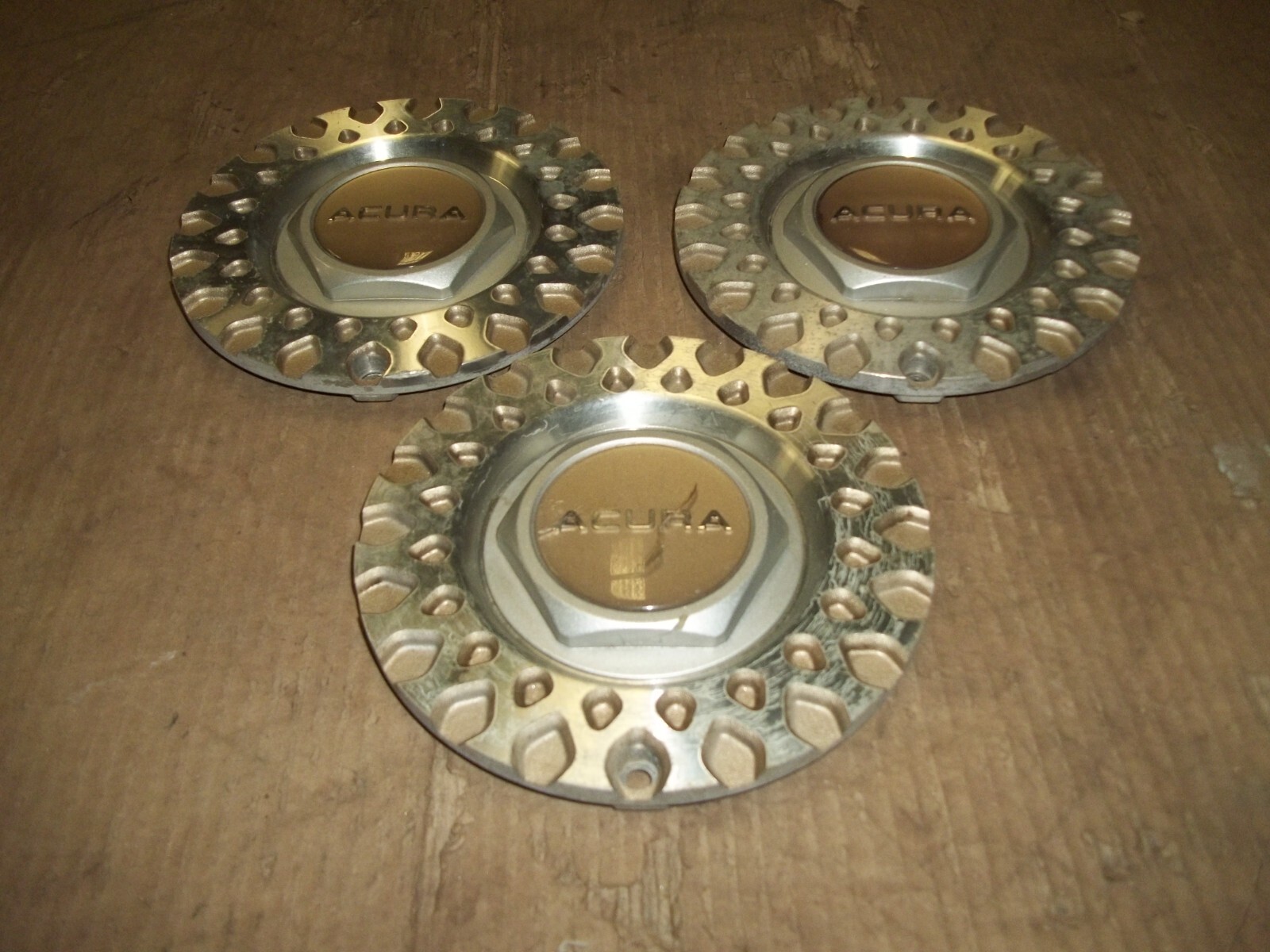 A set of THREE (3) Acura factory center caps.Manufacture part # 08W15-SM4-C\_000 cast on back which must be matched for correct replacement.Measure about 6 1/4" across the front.Bolt on style, bolts are not included.Die cast material with plastic center emblem.Match pictures and description for correct replacement.This is a good used set of three with MANY scratches / scrapes and marks.These scratches / scrapes and marks will be noticeable from even a short distance.The original finish is VERY faded and worn due to time.Oxidation and corrosion.Staining that does not polish off.Finish peeling with lines under clear coat.Pitting on finish.Shine or brightness different shades.One plastic center emblem cracked as pictured.Driver car quality.On a scale from 1 to 10, these rate a "6" in condition.Buyer to pay shipping with a flat rate of $15 within the continental U.S..Elsewhere there are additional charges.Accept most methods of payment.California buyer to pay state sales tax.