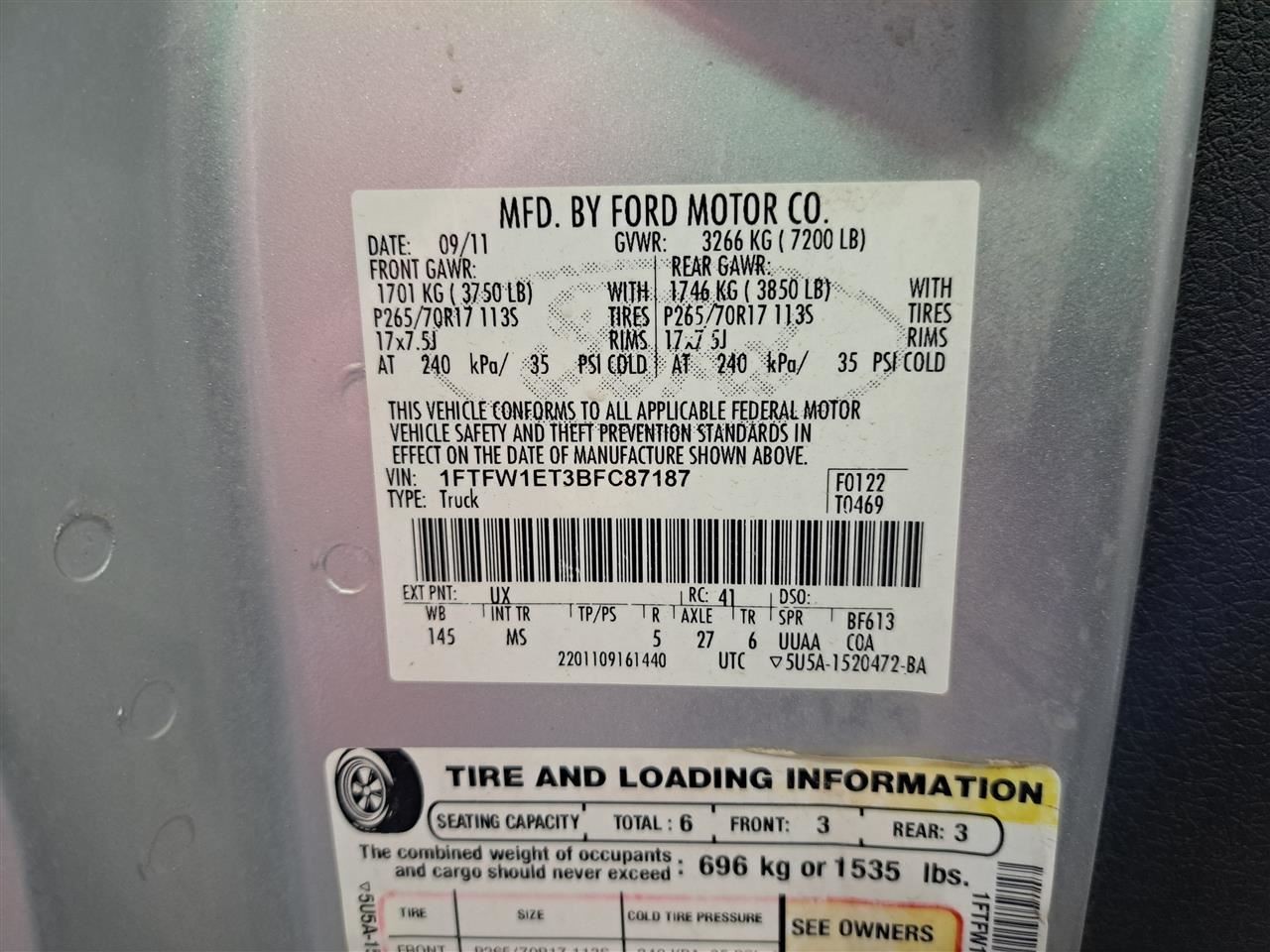 - Donor VIN: 1FTFW1ET3BFC87187