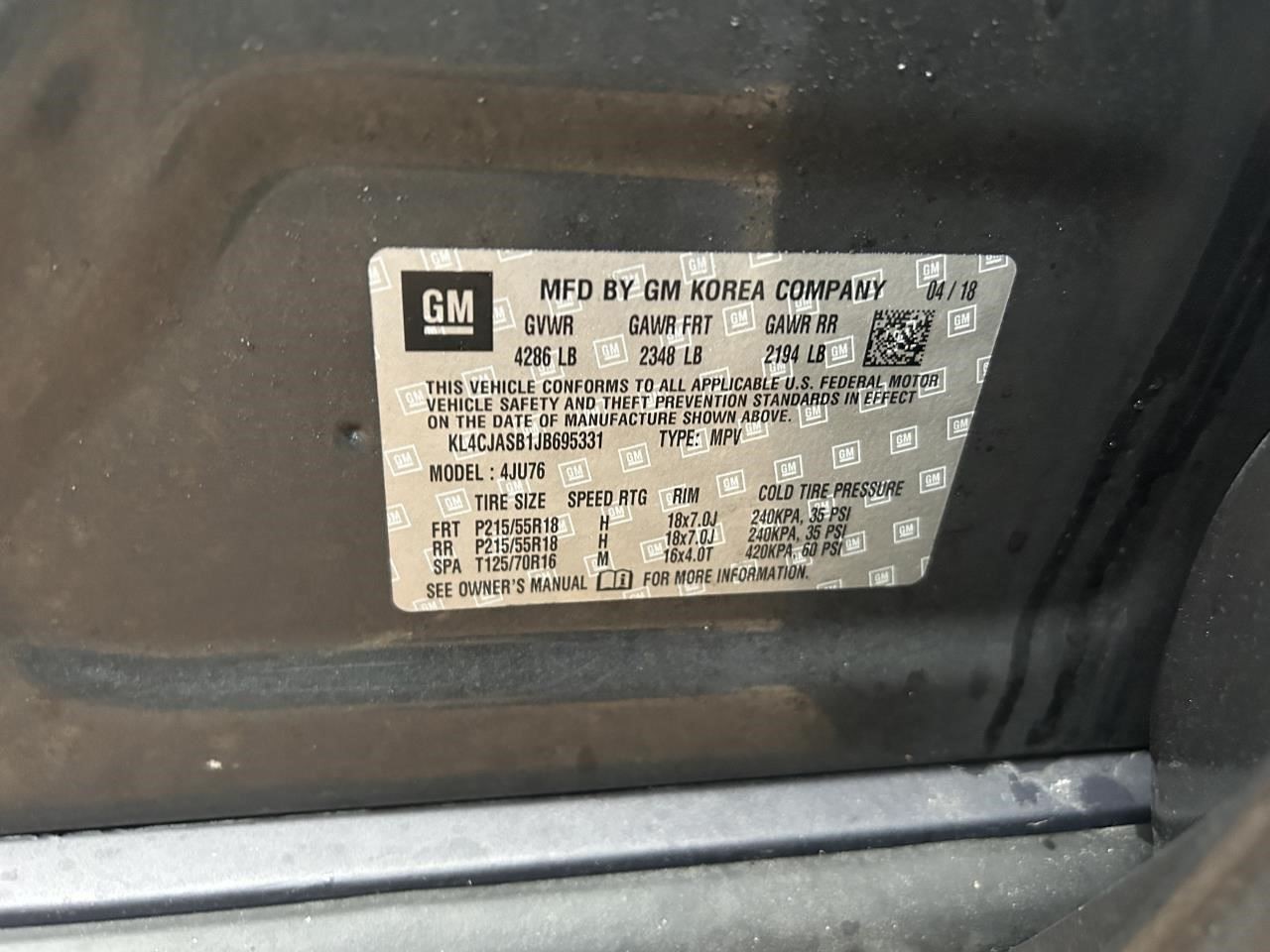 - VIN #: KL4CJASB1JB695331