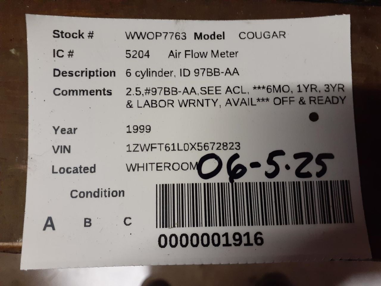 Air Flow Meter 6 Cylinder ID 97BB-AA Fits 99-02 COUGAR 635586