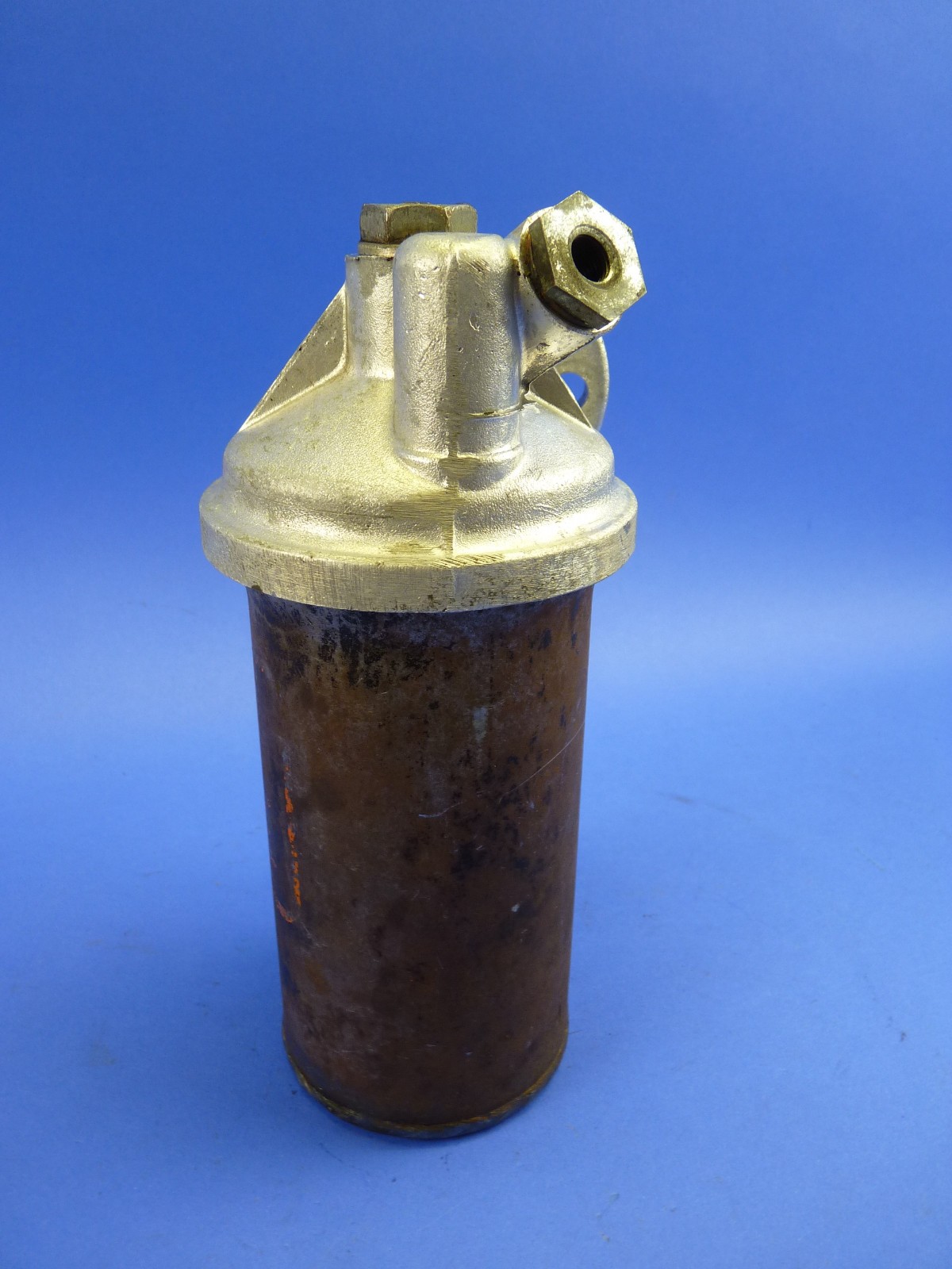 Alfa Romeo Comit 105 series oil filter canister assembly. Nice used with a head that is slightly dull on the COMIT side and brighter on the opposite side. There is some rust on the upper filter seat and the oil pressure sending unit is missing. There is still some dirt on the head and it has a few small nicks. The canister has some light surface rust and scratches on the outside and is missing nearly all of its original paint. The inside is nice except for some light rust around the outer edge of the bottom and some heavier rust around the welded bolt. The lower filter seat has some rust and the seal is rusted to the retainer. The bolt has some damage due to wrench slips. Please look at the pictures carefully. Please verify your application. When placing a multiple item order please request an invoice before payment as I can usually lower the shipping charges which are often inflated by the summation of individual item shipping costs. Local pickup is available. Positive feedback will be left after you receive your order and leave me positive feedback. RRII6a