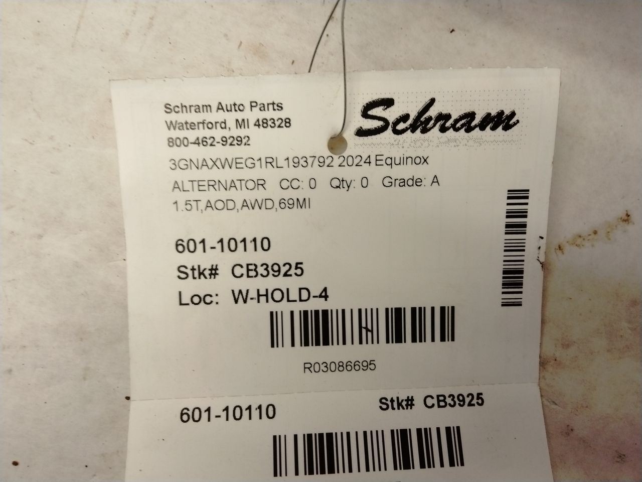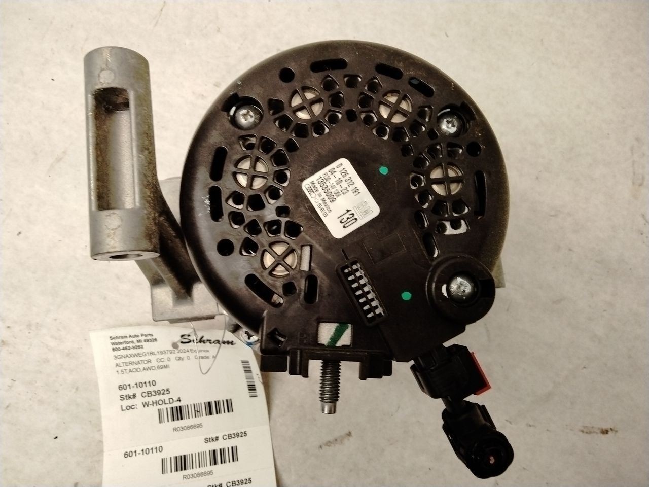 1923   Description 1.5T,AOD,AWD,69MI Mileage: 0 This item will fit the following vehicles/applications: EQUINOX 18-20 1.5L EQUINOX 21-24 TERRAIN 18-20 1.5L TERRAIN 21-24 **Original Equipment Alternator** **Schram Auto Parts – Trusted OEM Quality Since 1923** This listing features a genuine **OEM Alternator**, responsibly sourced and tested to ensure dependable performance. Whether you're replacing a failed unit or restoring electrical function, this alternator delivers the quality and compatibility you expect from factory-original equipment. **Fitment Reminder:** Please use the part number, images, and the provided 'Fitment Guide' to confirm this alternator fits your vehicle. Compatibility may vary by engine size or trim. The buyer is responsible for confirming fitment prior to purchase. **Condition Notes:** This alternator is a used OEM part that has passed thorough testing. Cosmetic wear from normal use may be present, but all mounting points and electrical connections are intact and ready for installation. **Expert Help Available:** Have questions about compatibility or installation? We’re happy to assist with confirming vehicle-specific fitment. Upgrade your vehicle's charging system with confidence. Trust Schram Auto Parts to deliver tested OEM alternators and excellent customer service—backed by over a century of automotive expertise. Vehicle 2024 Equinox Mileage 0 Part Grade A What's this?