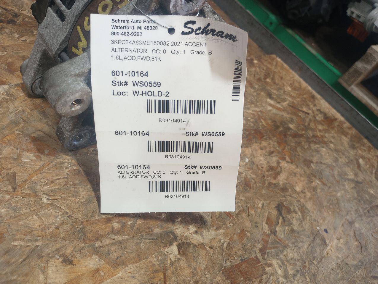 1923   Description 1.6L,AOD,FWD,81K Mileage: 81000 This item will fit the following vehicles/applications: ACCENT 20-22 ELANTRA 21-24 1.6L, turbo KONA 22-24 1.6L (turbo) RIO 20-23 SELTOS 24 1.6L **Original Equipment Alternator** **Schram Auto Parts – Trusted OEM Quality Since 1923** This listing features a genuine **OEM Alternator**, responsibly sourced and tested to ensure dependable performance. Whether you're replacing a failed unit or restoring electrical function, this alternator delivers the quality and compatibility you expect from factory-original equipment. **Fitment Reminder:** Please use the part number, images, and the provided 'Fitment Guide' to confirm this alternator fits your vehicle. Compatibility may vary by engine size or trim. The buyer is responsible for confirming fitment prior to purchase. **Condition Notes:** This alternator is a used OEM part that has passed thorough testing. Cosmetic wear from normal use may be present, but all mounting points and electrical connections are intact and ready for installation. **Expert Help Available:** Have questions about compatibility or installation? We’re happy to assist with confirming vehicle-specific fitment. Upgrade your vehicle's charging system with confidence. Trust Schram Auto Parts to deliver tested OEM alternators and excellent customer service—backed by over a century of automotive expertise. Vehicle 2021 ACCENT Mileage 81000 Part Grade B What's this?