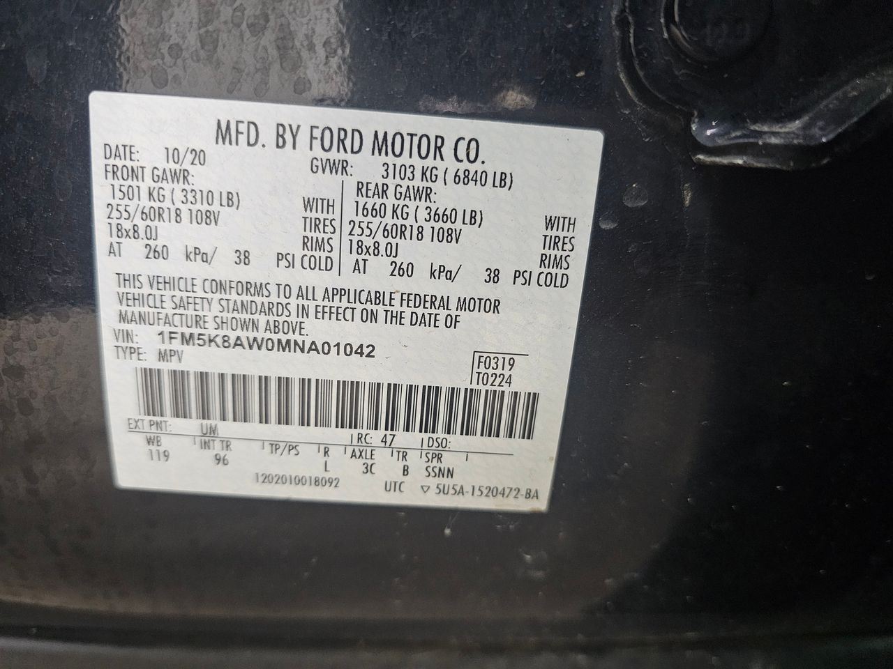 - VIN #: 1FM5K8AW0MNA01042