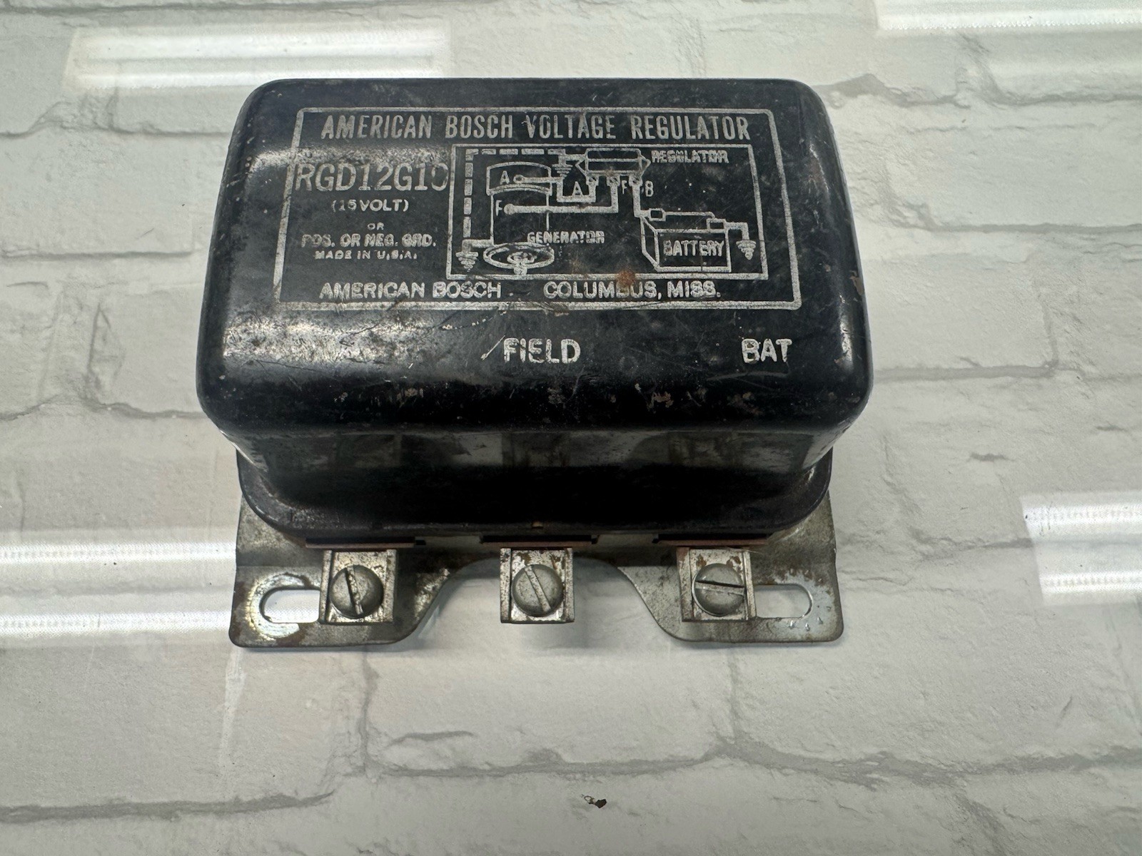 Was working when removed has been sitting in storage a long time The American Bosch Voltage Regulator is a reliable and high-quality part designed for Ford cars and trucks from 1956 to 1962. This regulator, with model number RGD12G10, is specifically made by Bosch, a trusted brand known for producing durable vehicle components. It is essential for maintaining the electrical system's stability and ensuring optimal performance in classic Ford vehicles.
