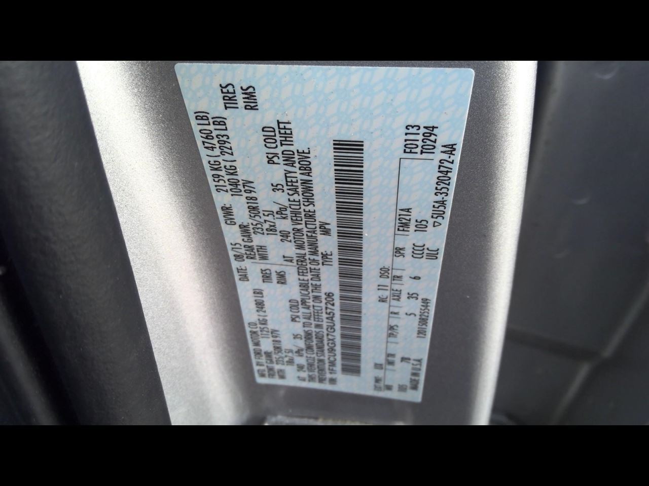 - VIN #: 1FMCU9GX7GUA57206