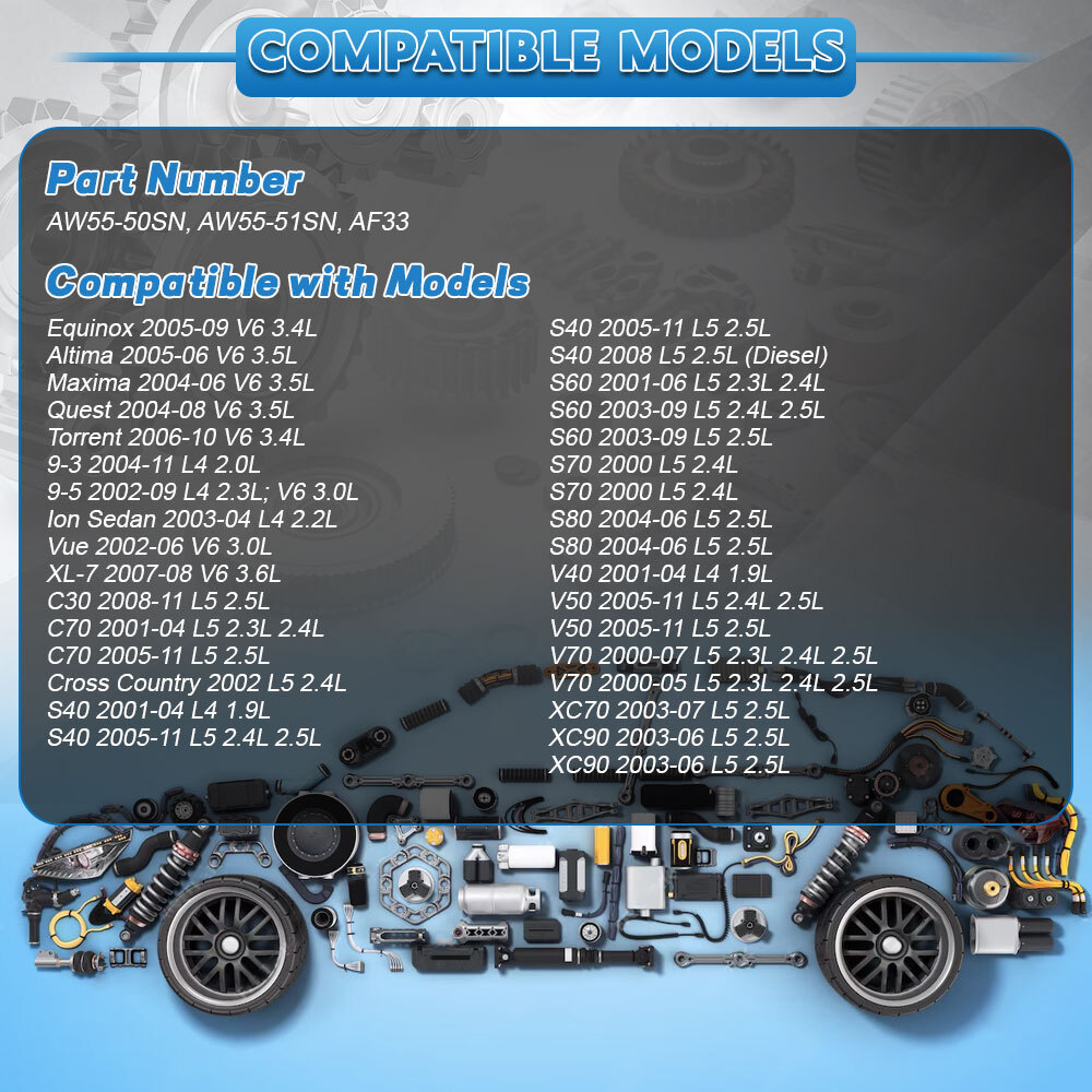 Stable performances, high reliability, suitable for replacing your broken one. Fit: Equinox 2005-09 V6 3.4L Altima 2005-06 V6 3.5L Maxima 2004-06 V6 3.5L Quest 2004-08 V6 3.5L Torrent 2006-10 V6 3.4L 9-3 2004-11 L4 2.0L 9-5 2002-09 L4 2.3L; V6 3.0L Ion Sedan 2003-04 L4 2.2L Vue 2002-06 V6 3.0L XL-7 2007-08 V6 3.6L C30 2008-11 L5 2.5L C70 2001-04 L5 2.3L 2.4L C70 2005-11 L5 2.5L Cross Country 2002 L5 2.4L S40 2001-04 L4 1.9L S40 2005-11 L5 2.4L 2.5L S40 2005-11 L5 2.5L S40 2008 L5 2.5L (Diesel) S60 2001-06 L5 2.3L 2.4L S60 2003-09 L5 2.4L 2.5L S60 2003-09 L5 2.5L S70 2000 L5 2.4L S70 2000 L5 2.4L S80 2004-06 L5 2.5L S80 2004-06 L5 2.5L V40 2001-04 L4 1.9L V50 2005-11 L5 2.4L 2.5L V50 2005-11 L5 2.5L V70 2000-07 L5 2.3L 2.4L 2.5L V70 2000-05 L5 2.3L 2.4L 2.5L XC70 2003-07 L5 2.5L XC90 2003-06 L5 2.5L XC90 2003-06 L5 2.5L Package includes: 1set AF33 Transmission Linear Solenoid Set Kit Details **Duty For International Buyers** Import duties, taxes and charges are not included in the item price or shipping charges. These charges are the buyer's responsibility. **Shipping Policy** Expedited Shipping(FedEx/DHL/TNT/UPS): To USA 3-6 Workdays ,To other countries 3-8 Workdays Economy Shipping(Post/Airmail/DHL e-commerce): To USA 7-12 Workdays ,To United Kingdom & Australia 20-35 Workdays , To other countries 20-50 Workdays Please make sure to provide us with correct , precise and detailed shipping address and correct phone number Order will be shipped out within 1 to 3 business days upon payment received or cleared. If you don't receive package over 30 business workdays , please notify us. **Returns Policy** Customer satisfaction is our top goal. If product is defective or damage upon arrival, or wrong product shipped, please contact us immediately. Returns accepted within 30 workdays of delivery date and item must be in original new condition, not worn or altered in any way with attached tags & wrap. Otherwise deal is final. Return shipping must be paid by buyer. Please contact us first if you have any problems/questions/concerns. We will be happy to resolve any issues you may have in a cordial and friendly manner. **Feedback & Contact US** We will reply every message and solve the problem within 24 hours (except holiday). If you have any problem or concerns whatever with your order or products, please mail us and give us a chance to assist you before leaving any feedback. We maintain high standards of excellence POSTIVE FEEDBACK and strive for 100% customer satisfaction! Feedback is very important to us. We request that you contact us immediately BEFORE you give us neutral or negative feedback, so that we can satisfactorily address your concern. * * * On Oct 24, 2025 at 11:46:35 PDT, seller added the following information: