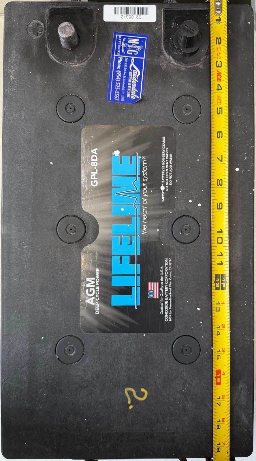 Specifications: • Voltage: 12 V • Capacity: 255 Ah (20 hr rate) • Type: AGM, Sealed Lead Acid (maintenance-free, non-spillable) • Manufacturer: Concorde Battery Corp., USA • Model: GPL-8DA Condition: ✅ Tested with Viking Battery Analyzer — PASS / Good Condition • State of Health: 100 % • State of Charge: 100 % • Voltage: 12.83 V • Internal Resistance: 2.1 mΩ • Measured CCA: 1174–1250 A Physical Dimensions (approx.): • Length: 20.5 in (52 cm) • Width: 10 in (25 cm) • Height: 9.4 in (24 cm) 💧 Maintenance-free sealed AGM — no need to add water or electrolyte. 🔧 Perfect for yachts, RVs, solar systems, or backup power setups.