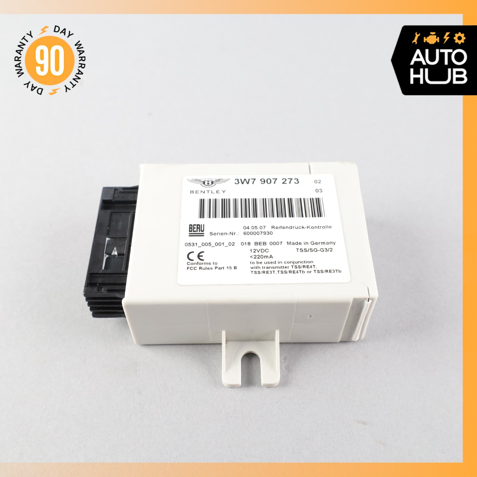 ## 06-07 Bentley Continental GTC GT Flying Spur ## Tire Pressure Monitoring System TPMS Module ## 3W7907273 OEM 62k Original Bentley part. Came off of GTC with 62k miles. Item is in good working condition. Please make sure to match the part number. ### PLEASE READ BELOW: ###### When you buy our item you agree to our terms and conditions ### Item Condition: Good / Normal Use / As shown in the photos / It is buyer's responsibility to carefully inspect all of the photos for details and/or request more photos if necessary. - PLEASE VERIFY THE COMPATIBILITY BEFORE BUYING OR **SEND US YOUR VIN NUMBER AND WE WILL ASSIST YOU****.** - IT IS THE BUYER'S RESPONSIBILITY TO DETERMINE WHETHER THE PART WILL FIT HIS/HER CAR. - PLEASE MAKE SURE TO MATCH THE PART NUMBER WITH YOUR ORIGINAL PART. - WHAT YOU SEE IN THE PHOTOS IS WHAT YOU WILL RECEIVE. ### Shipping Policies: - You are welcome to pick up your item at our location. - Ground shipping rates apply to the continental United States. International shipping rates apply everywhere outside of the continental US. - When shipping internationally, parcels may be subject to Import Tax and Duty Charges, for which the buyer is responsible. - Any international customs fees must be paid by buyer. - International orders will be shipped via USPS or FedEx International. Shipping cost or carrier may change, based on final destination. - Puerto Rico, Virgin Islands, Hawaii and Alaska **will require additional shipping charge.** - Most small items purchased **before 2:00pm (14:00) PST will be shipped the same day.** With the exception of items requiring special packaging.Orders processed **after 2:00pm PST will be shipped the same or the following day.** - Processing time for larger sized items is 1 business day. Large items include: hood, door shell, fender, engine, transmission, trunk shell, hatch, windshield, bumper, reinforcement clip, subframe, roof, quarter apron, gas tank, etc. - Large items can only be shipped to a business/commercial address via Freight Shipping. - Freight Shipping companies require the customer to unload the shipment. If you are not able to unload your shipment, the shipping company will charge for unloading on your behalf. - To pass our shipping savings on to you, we may alternate between FedEx, USPS depending on which is most affordable and/or faster. ### Return Policy: - All returns must be made and will be accepted within 30 days of the item being received by the customer. Items eligible for return are non-functional or items that differ substantially from the description. Please, do not purchase parts just to check and diagnose your vehicle’s problem. - **We are not liable for any labor fees associated with the installation or removal of any parts we sell.** ### Warranty: - We offer a 90 DAY WARRANTY on all of our parts. - All of the parts are tested either before or after removal from the vehicle. - Before purchasing an item, the customer **MUST** verify that the item will fit his/her vehicle. - Item may show light scuffs, scratches or other imperfections as a result of this **being a used part.** ### Contact us: - If you have a question about any part please contact us before purchasing. ### Important! Once you have received your item in satisfactory condition, please leave us feedback. If there is a concern or issue that would cause you to want to leave negative feedback, please contact us first and we will do our best to resolve the problem and satisfy the situation. Thank You