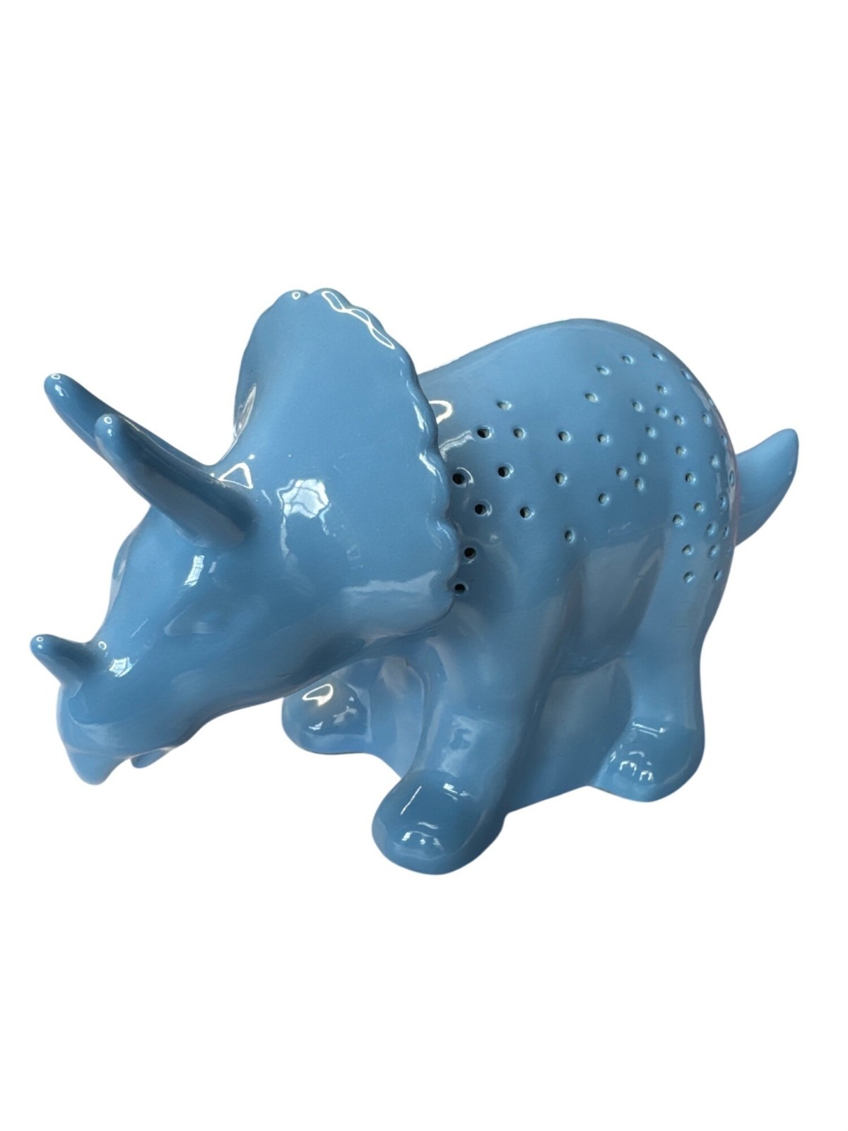 Who needs a boring lamp when you can have a glowing triceratops? Brighten up your room with this dino-mite night light. Literally. • Ceramic construction • On/off switch on cord • Emits soft light through perforations • Fun dinosaur design • Suitable for tabletop use Measures approximately 9.5 inches long and 5.5 inches tall. Features: • N/A • All season • Glossy • China • Wipe clean with a dry cloth Size: N/A Condition: New With Tags N/A