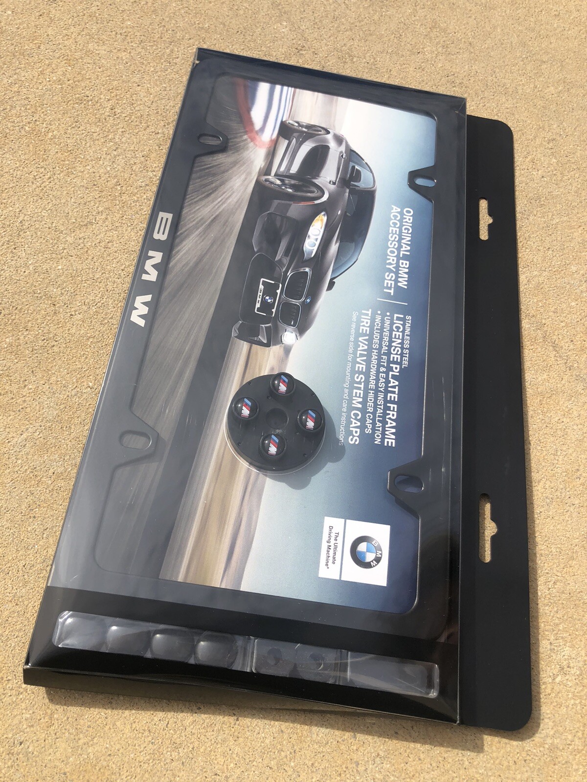 Hello, Up for sale a set of brand new OEM Genuine BMW valve stem cap and license frame come with - slim license frame - ///M valve stem caps (4) - black hider caps (4) Shipping inside the USA $10. Canada $29.00... Worldwide $49.00 Thank You.
