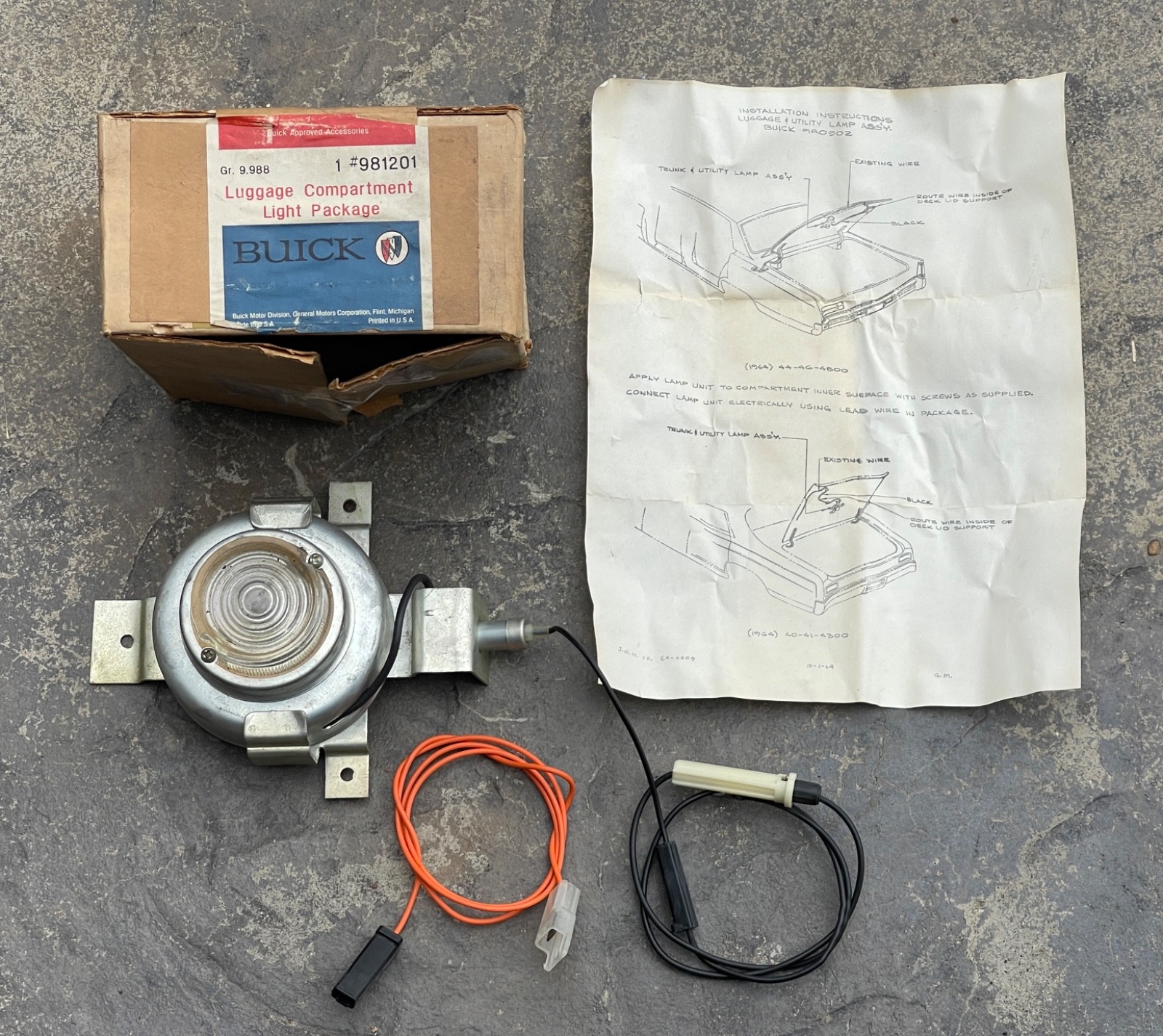 Welcome to Sharkys Speed Shop! **"NEW"** ## **OEM NOS** Accessory Under Hood & Luggage Compartment Trunk Light Lamp. **GM Accessory Part Number: 981201** **Fits.1964 1965 1966 1967 1968 1969 1970 Buick All.** **Excellent NOS Condition ! Nothing broken, cracked, or missing Pieces.** **LQQK ! ! ! Please do your own homework to make sure this Fits your vehicle Before you purchase.** **Ask questions Before you purchase.** **Please study the pictures and determine the condition for yourself as they are part of description.** **You will receive everything you see in the pictures, if it is not pictured then it's not included.** **Please confirm this item is correct for your application before to purchase** **DISCLAIMER** Please keep in mind that we sell mostly USED vintage auto parts NOT new ones. Occasionally we sell vintage NOS parts they may have shelf/box wear. If this is the case it will be mentioned in the listing. Many are very old, rare or hard to come by and have no MANUFACTURE or SELLERS WARRANTY, Therefore we don't accept returns but yes we will do in some special cases and you are paying for the shipping back to us. IF YOU DON'T FEEL COMFORTABLE WITH THIS, please don't buy to avoid any possible disagreement. We sell QUALITY auto parts and all of them are in GOOD, VERY GOOD OR IN EXCELLENT CONDITION. (check our feedback) so please bid with confidence!!!! We know that you won't be disappointed!!! ## **PAYMENT** Paypal is the preferred method of payment. **SHIPPING** **Domestic / International Shipping:** Excluding items offering free shipping, buyer is to pay Flat Rate shipping costs. We offer combined shipping and will do our best to safely package as many items as possible into one box. We package every item with the utmost care and use packaging materials to ensure the best possible protection during transit. All items valued at or in excess of $250 will be shipped with Signature Confirmation. Additional shipping fees are required for locations including, but not limited to: Alaska, Hawaii, Puerto Rico, Guam, Canada and other countries outside the USA. __**We Do Not ship to APO / FPO and PO Box addresses.**__ We ship Monday through Friday, excluding holidays. Most domestic orders will arrive 4-7 business days and international orders can take up to 45 days.orders that are placed on Saturday and Sunday will be shipped out Monday. We offer shipping via FEDEX Ground and USPS for domestic shipments, FEDEX Standard & USPS to Canada, and USPS Priority Mail International for international shipments. After the item has left out facility, the international tracking code will be provided. There will be a surcharge which will be billed to your Pyapal after purchase to cover the procedure needed in order to insure a smooth delivery. It could take up to 45 business days for the item to arrive at you destination. Please Note: Import duties, taxes, and charges are not included in the item price or shipping cost. These charges are the buyer's responsibility. Customs fees are normally charged by the shipping company or collected when you pick the item up. These fees are not additional shipping charges. **TERMS OF SALE** **Return Policy:** We make every effort to describe each item we sell to the best of our abilities and strive to make your purchase both pleasant and memorable. If for any reason you are not 100% satisfied with your purchase, please contact us within 3 days upon receipt of delivery so that we may be able to address your concerns. All costs associated with return shipping is the responsibility of the buyer. **Insurance Claim Policy:** We package every item with the utmost care and use packaging materials to ensure the best possible protection during transit. Unfortunately, some times even the best proactive shipping measures are not enough to prevent catastrophe; for this reason, we insure every package we ship. If your item(s) arrive damaged or has not arrived after 21calendar days (Domestic shipments) or 45 calendar days (International shipments), please contact us so that we may file an insurance claim. Please retain all original packaging in the event that your item(s) had arrived damaged as shipping company will require photos of the damaged goods and packaging, and a signed claim statement from the buyer/recipient. A full refund of the original purchase price will be credited to the buyer immediately upon confirmation that the insurance claim has been processed. **ABOUT US** Sharkys Speed Shop! Please add us to your list of favorite sellers and visit often. Here atSHARKYS SPEED SHOP, we offer you the rarest and the most desirable vintage speed parts on the planet. We are committed to your satisfaction. Your positive feedback and 5 stars rating will be highly appreciated. If you are not satisfied by any means, please give us an opportunity to offer you a proper solution. **PLEASE INQUIRE IF YOU HAVE ANY QUESTIONS. 818 400-5233** ****Thank you for your business!!!**** Mopar Cuda Barracuda Challenger GTX Road Runner Belvedere Savoy Dart Duster valiant Satellite Wedge 273 318 340 360 383 400 413 426 440 LA R RB De Soto Chrysler Blower Super Charger Supercharger Altered Funny Car Dragster Slingshot Irwindale Raceway Lions Dragstrip San Fernando Plymouth DPCD Vintage Antique Classic, HP V8 Kit GPW USA Made Parts Race Gasser Dragster, Mount Patina Restore Restoration Ton Find Crusier, Lead Sled Original Driver Show Pre-War Closed Cab, Power COE 4WD Chassis Passenger Commercial Duty AA, 1938 1939 1940 1941 1942 1943 1944 1946 1947 1948 1941 Willys Coupe Sedan Pickup Rpadster 1955 Chevy Gasser 1933 Anglia, Drag Strip Funny Car 427 426 Blown Hemi SOHC NHRA, Halibrand 1932 1934 1936 Ford Coupe Hot Rod, Halibrand Cragar US Indy American Racing Wheels, 1932 3W Coupe Ramblers Car Club, Oregon Scappoose Airport Drag Strip Dragster, Drag Racing 1950s Hot Rod Trophy, SCTA CTA NWTA NHRA AHRA Indy 500 Car Midget Quater Midget Sprint Car uick Cadillac Chevrolet GMC Chrysler Dodge Ford, Lincoln Mer