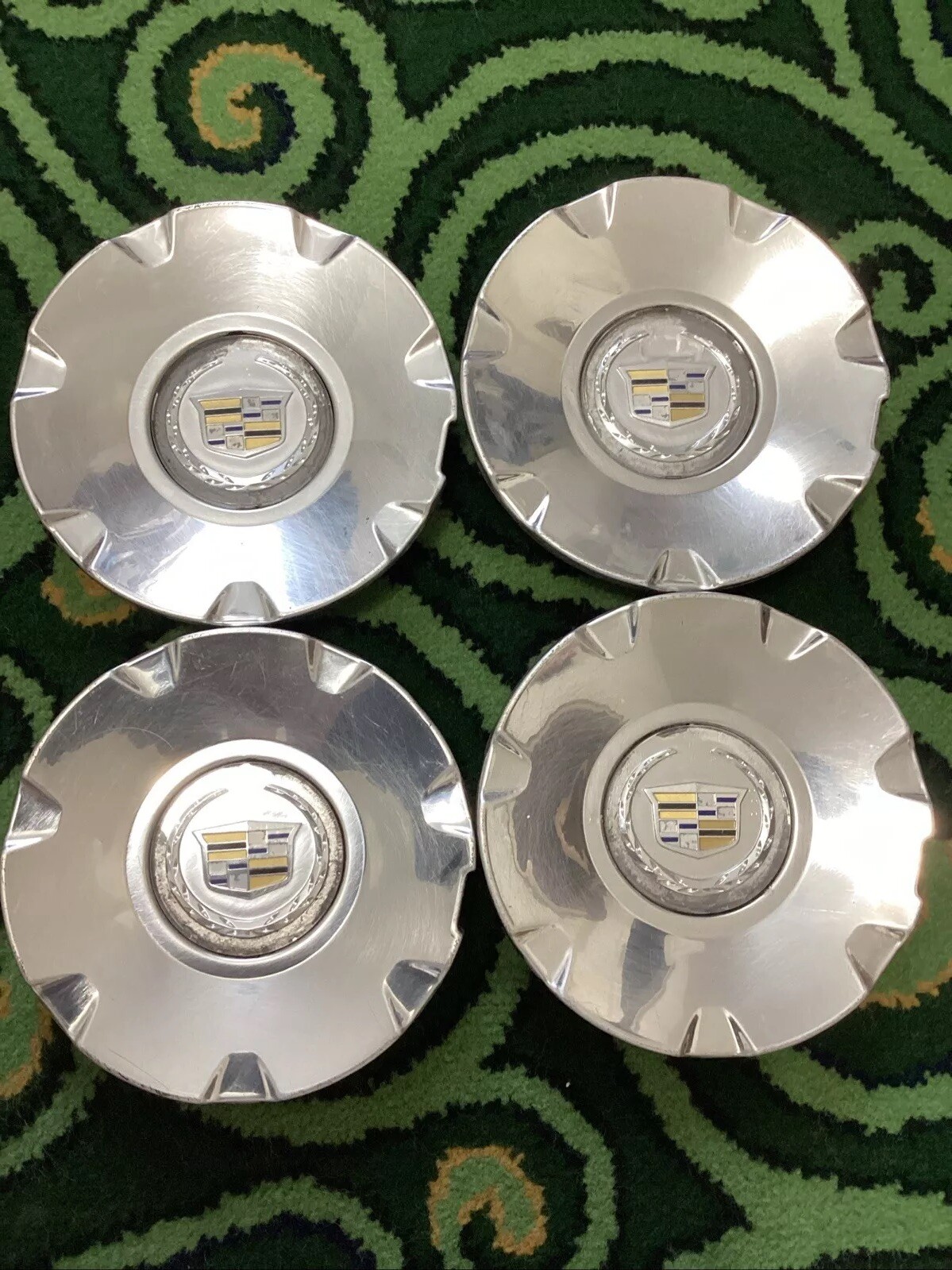 **Enhance the look of your Cadillac CTS or STS with this set of four center caps. Made from durable aluminum and plastic materials, these glossy finish caps are easy to install and fit the rear, left, front, and right placement on your vehicle. The outside diameter measures 6-1/4 inches and features the Cadillac emblem type.** **These OEM wheel center caps are designed for the 2004-2012 models and come with a manufacturer part number of 9595437. The set includes four pieces and is perfect for those who want to add a touch of style to their ride. Get your hands on these Cadillac center caps and enhance the overall appearance of your vehicle.used item showing normal wearing overall still intact 4pcs**