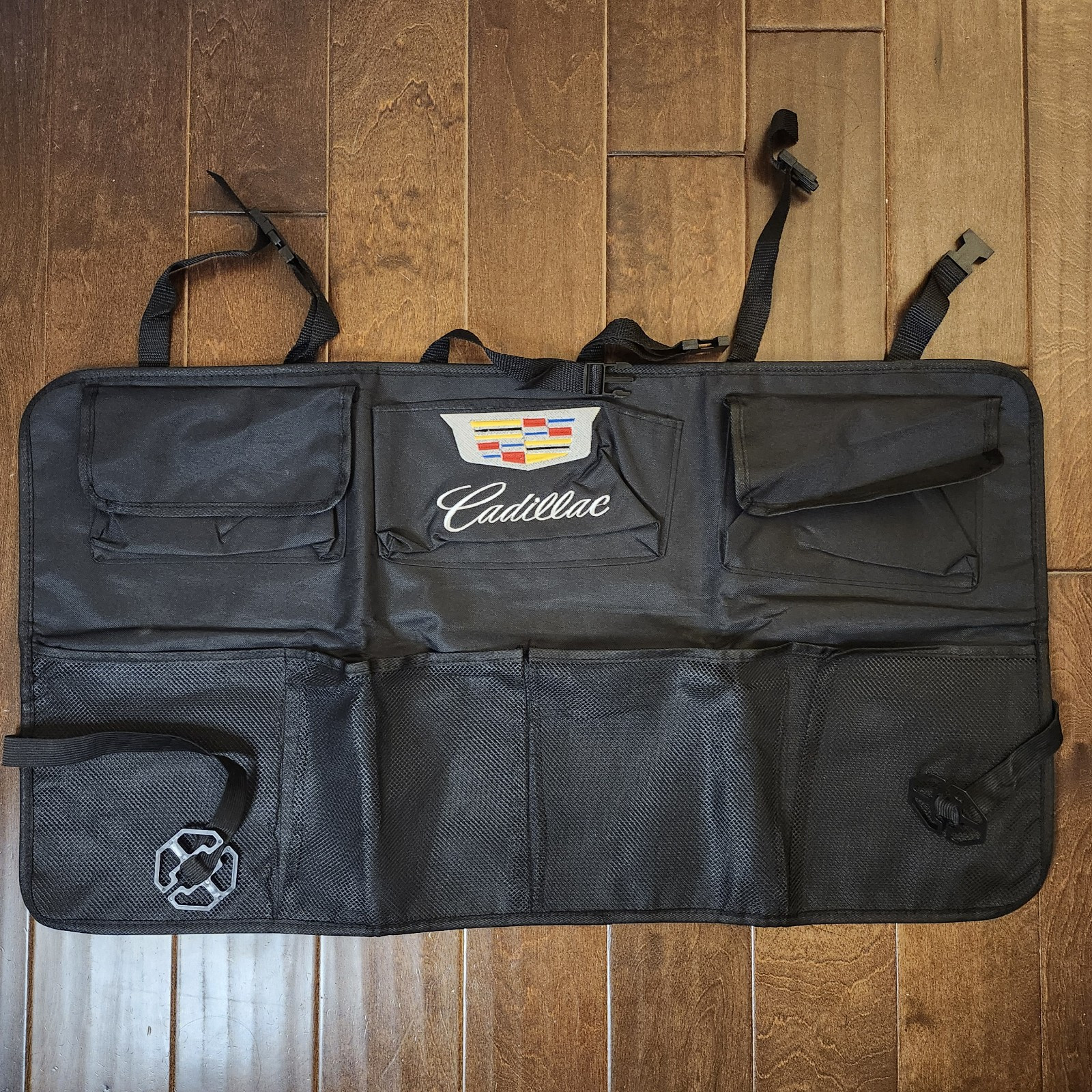 The Cadillac Trunk Organizer is designed for rear seat placement in the vehicle. It features a mesh net pocket for holding accessories and keeping items organized in the trunk. Perfect for Cadillac owners looking to efficiently store items and prevent them from shifting during transportation.