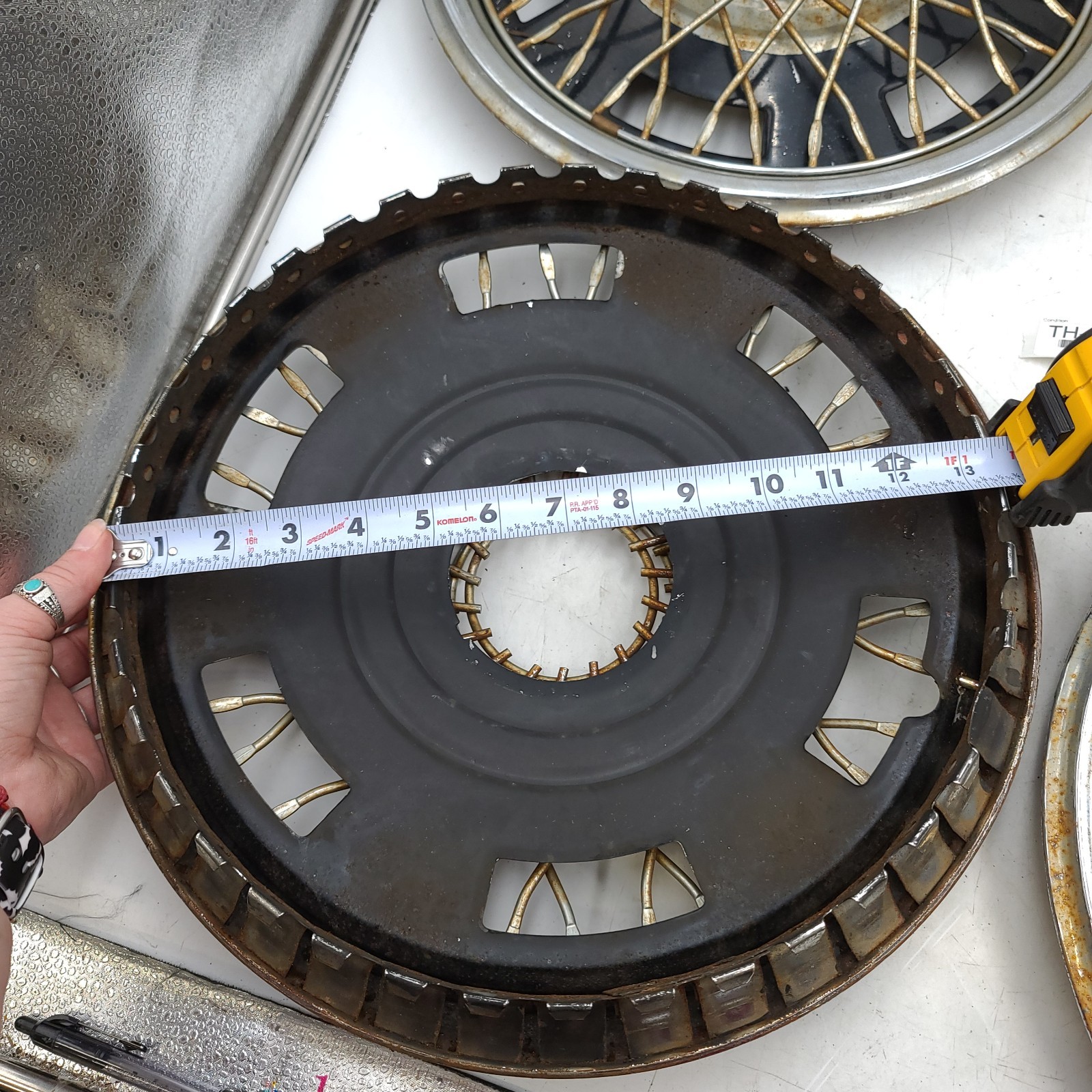 Vintage Universal 14" Wire Spoke Wheel Hub Cap Silver & Black Snap-On (Set of 4) **Description** Vintage Universal 14" Wire Spoke Wheel Hub Cap Silver & Black Snap-On (Set of 4). **Product Detail** **•** **Compatible Wheel Diameter** **:**14" **•** **Material** **:**Metal **•** **Color:**Silver & Black **•** **Type**: Hub Cap **Please message me if you have any questions.** **Used with signs of wear. Two are missing the 2-piece center caps. These are rusted and have mineral stains, some dings, scratches, and scuffs.** **Please look at all pictures before purchasing, as they are part of our condition description and contain measurements.**