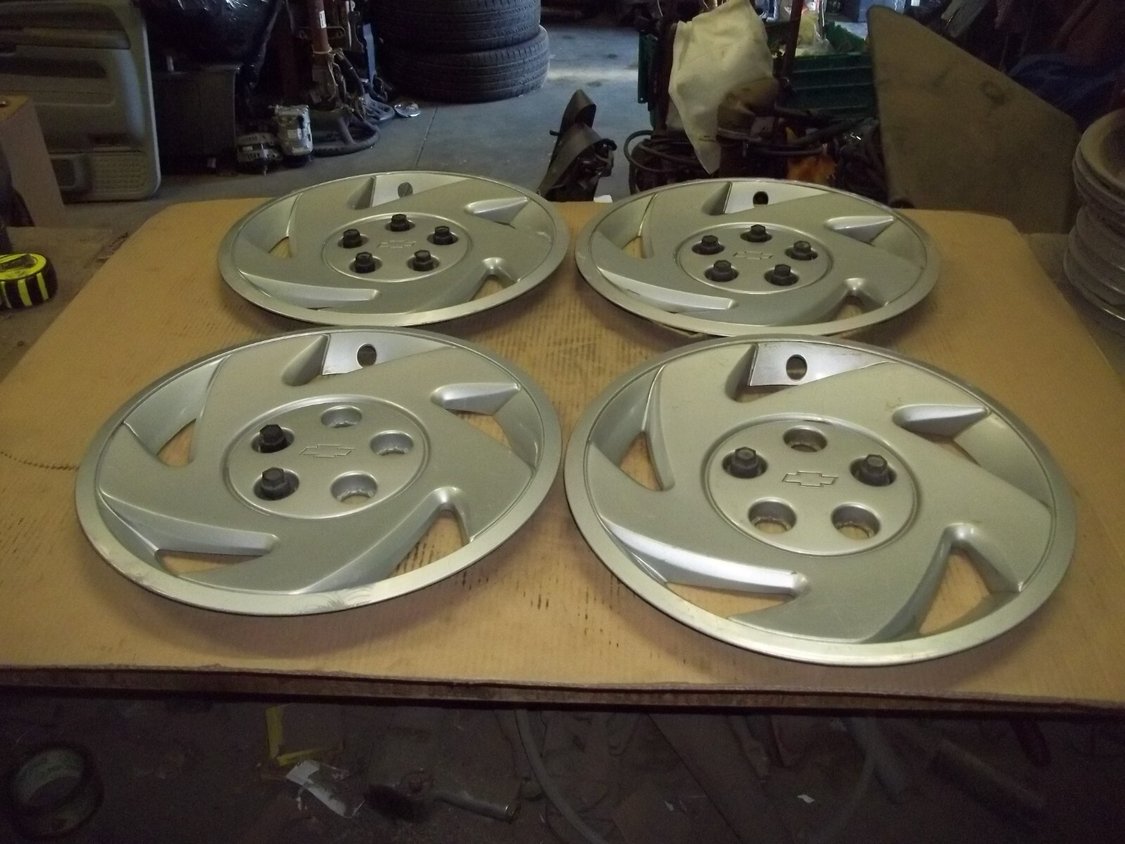 A set of FOUR (4) 93-97 Chevrolet Camaro 16" factory full wheel covers.Fit the following models listed below.Lug nut retaining caps used to attach to wheels.Six of these retaining caps missing and will be needed to attach.Factory metal lug nuts needed.There is No metal ring around edge on backs for retaining.This is a VERY used set with MANY scratches / scrapes and marks.These scratches / scrapes and marks will be noticeable from even a short distance.Faces and edges curb damaged.The original painted SILVER finish is VERY faded and worn dull due to time.Finish faded different shades of silver.Staining that does not polish off.Poor driver car quality.On a scale from 1 to 10, these rate a "5" or less in condition.Buyer to pay shipping with a flat rate of $25 within the continental U.S..Elsewhere there are additional charges.Accept most methods of payment.California buyer to pay state sales tax. FIT : 93-97 Camaro 16" SIX RETAINING CAPS MISSING AND WILL BE NEEDED TO ATTACH